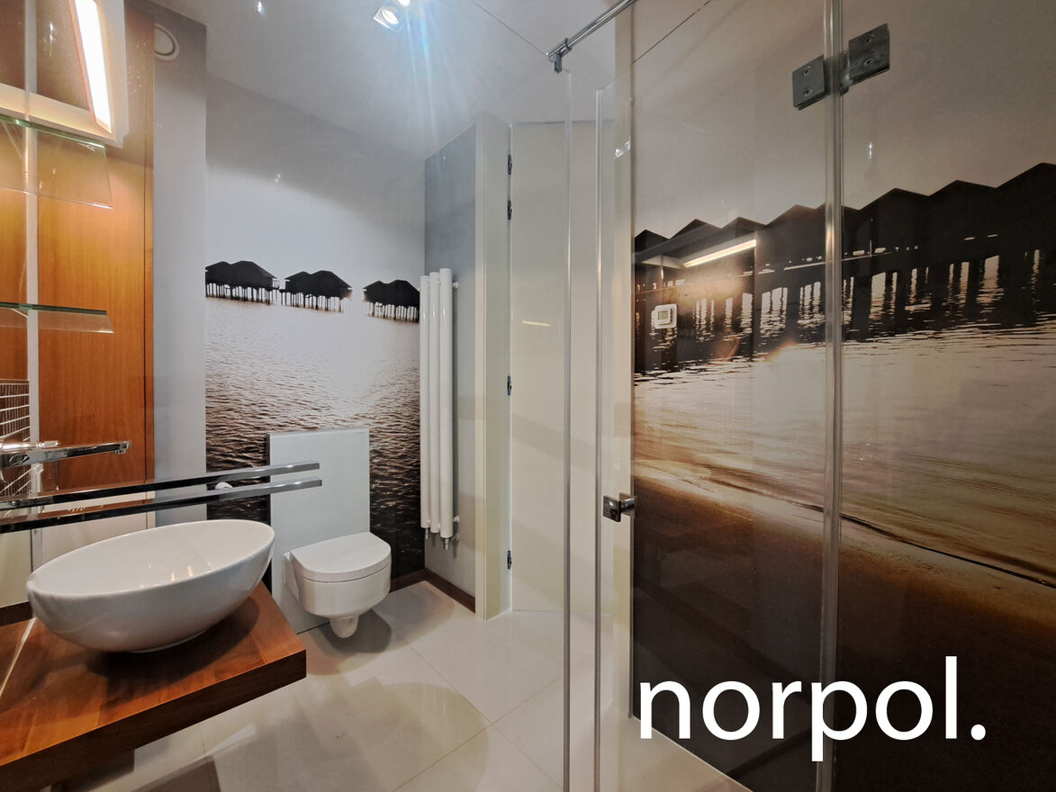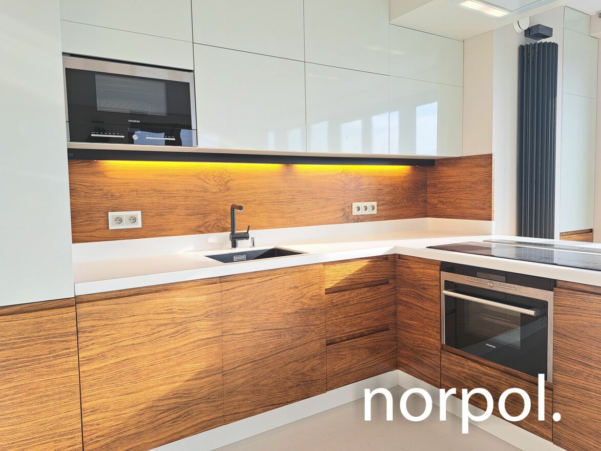 Całe mieszkanie jest starannie zaprojektowane, wykończone z użyciem materiałów wysokiej jakości. Salon połączony z kuchnią, dzięki dużym oknom jest jasny i przytulny. Dodatkowy komfort zapewnia klimatyzacja. Ciekawie design wszystkich drzwi sprawia, że mieszkanie wydaje się wyższe niż w rzeczywistości.