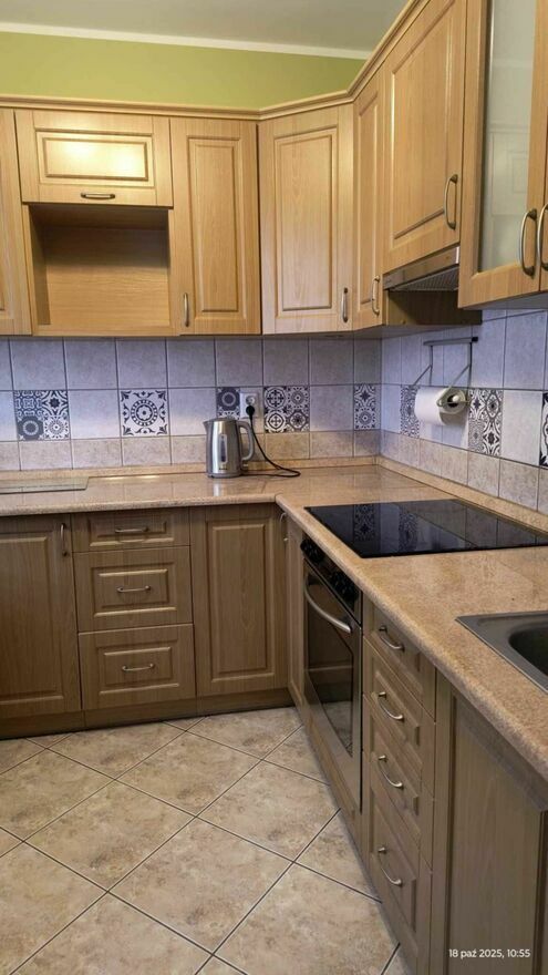 • Osobna, widna kuchnia z oknem – wyposażona w lodówkę, kuchenkę ceramiczną z piekarnikiem, czajnik elektryczny, ekspres do kawy oraz podstawowe naczynia.