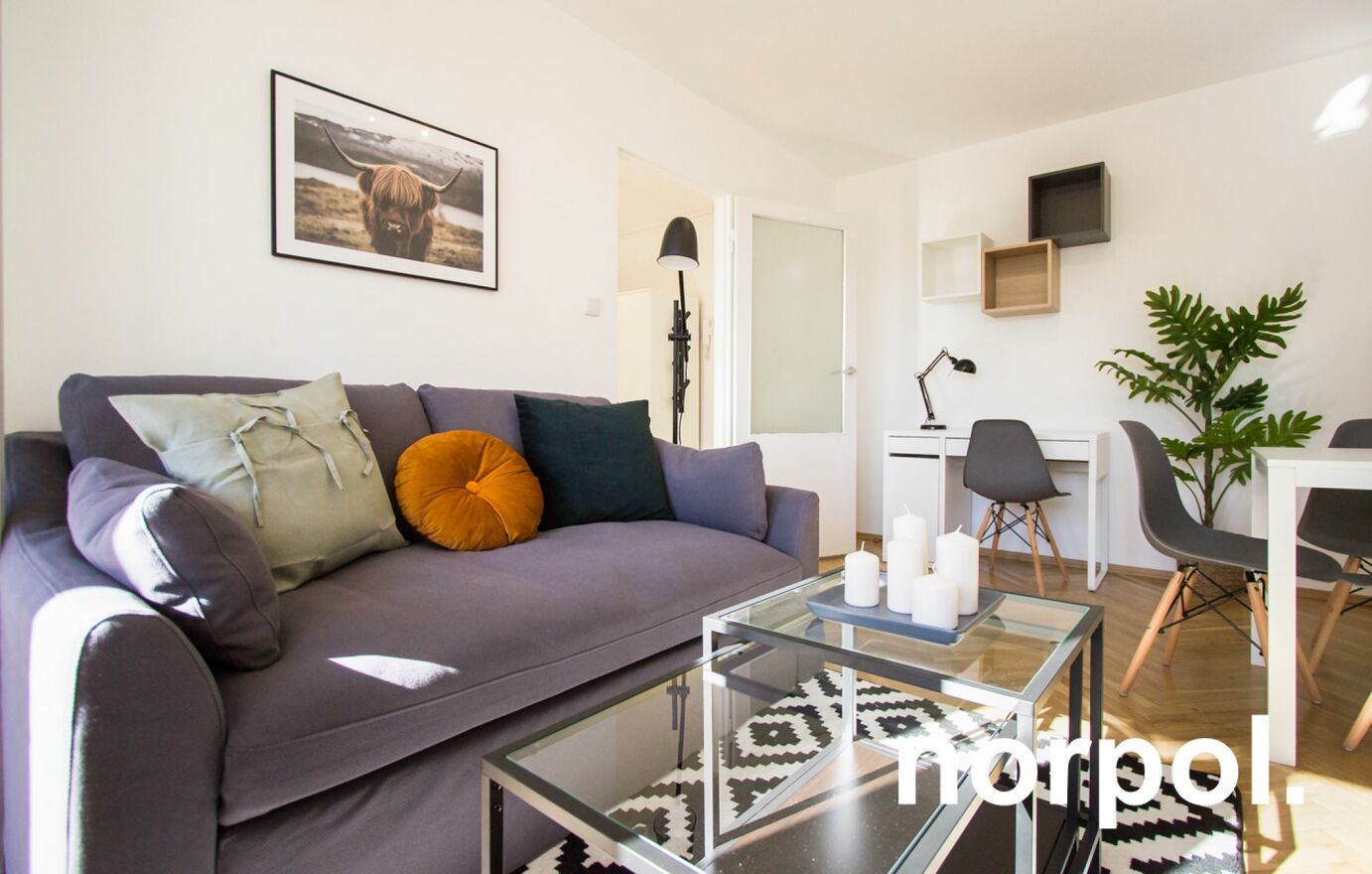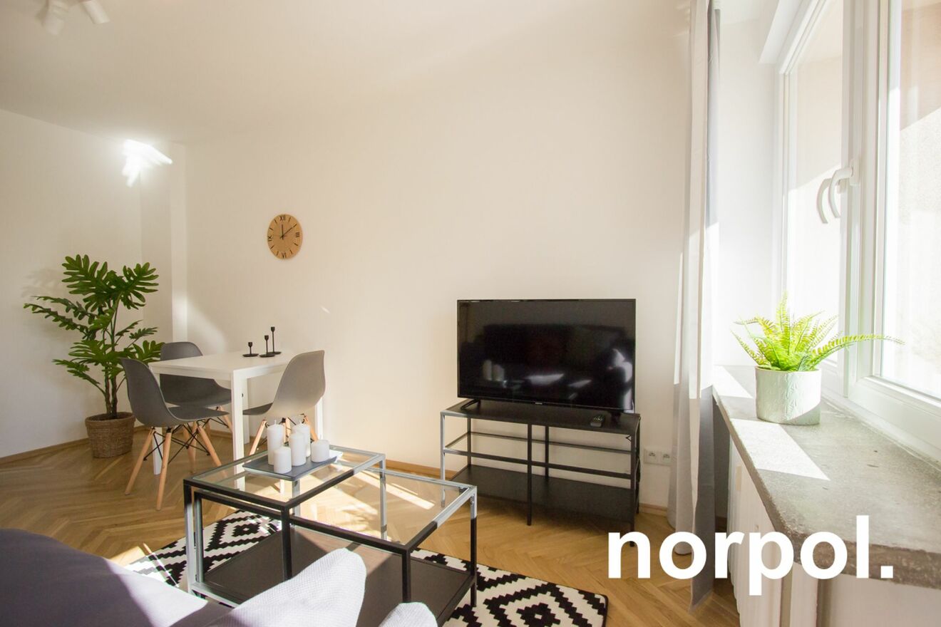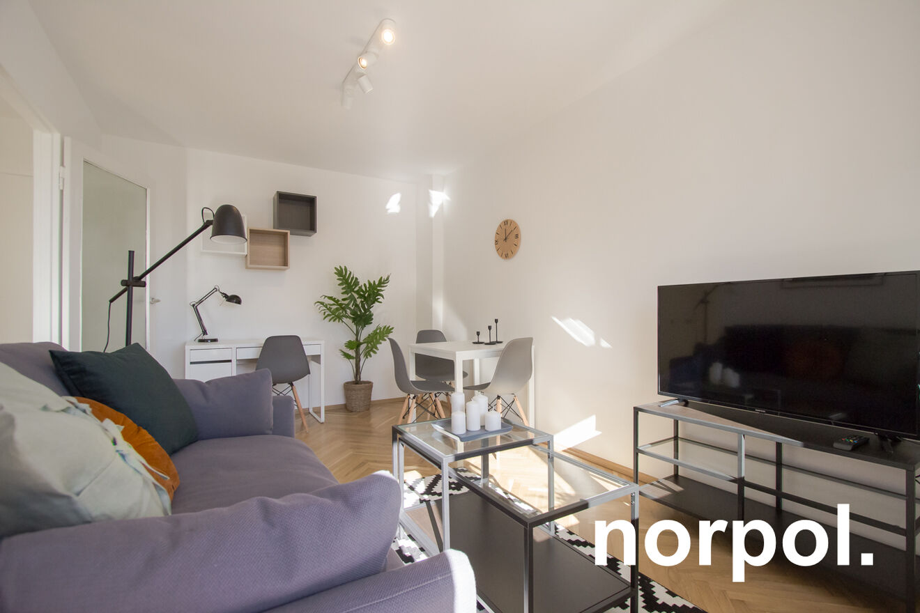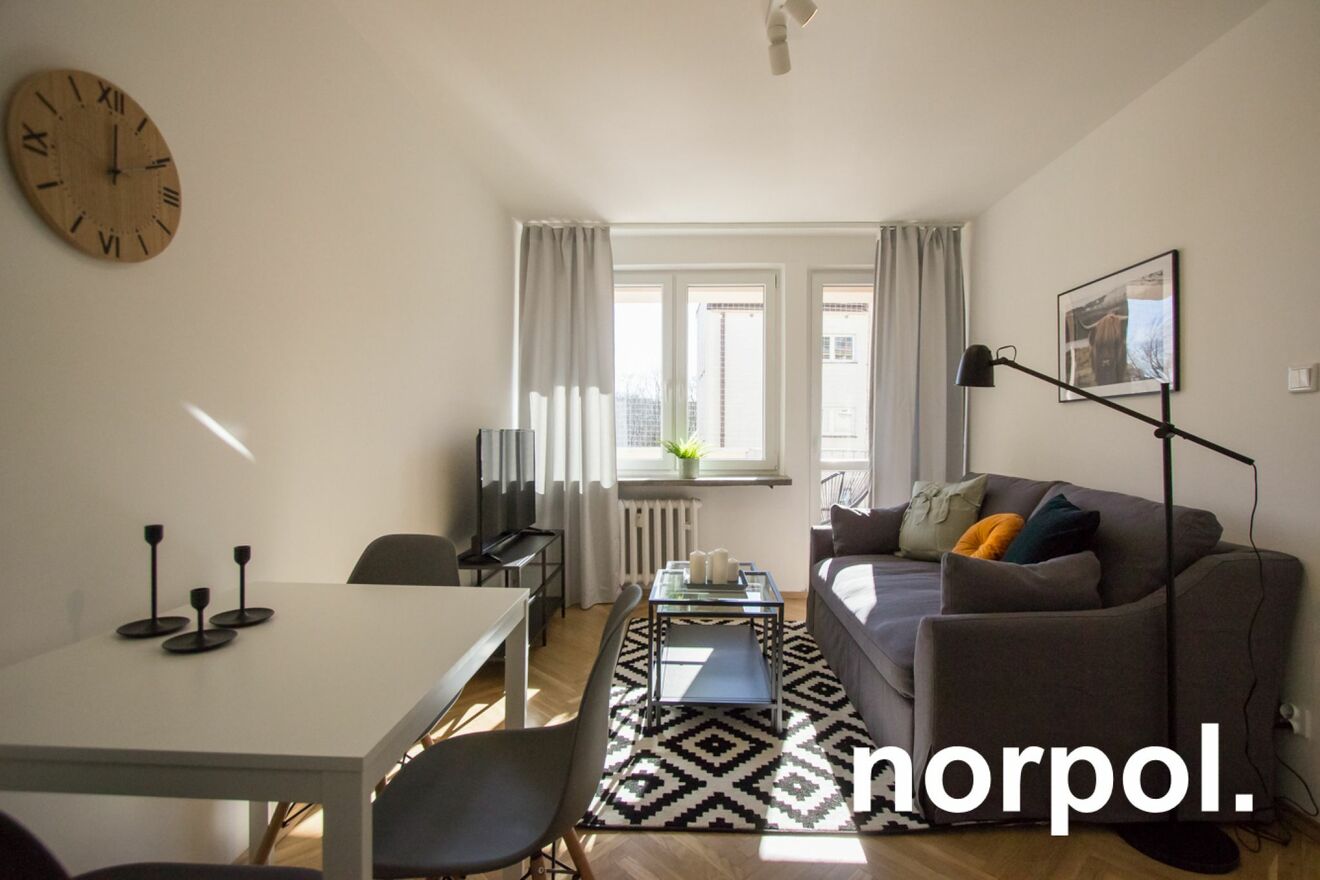 The 37.70 m² apartment is located on the third floor of a well-maintained tenement building. Thanks to its south-facing windows and balcony, the interior is bright and sunny throughout the day. The apartment has been recently renovated and is decorated in a modern, inviting style, and the balcony offers a view of Nowowiejski Square.
