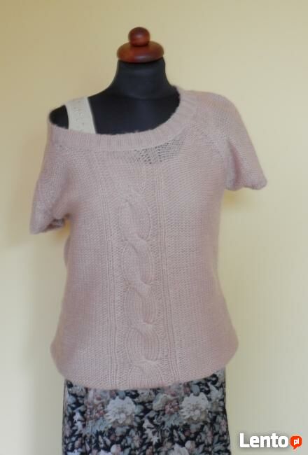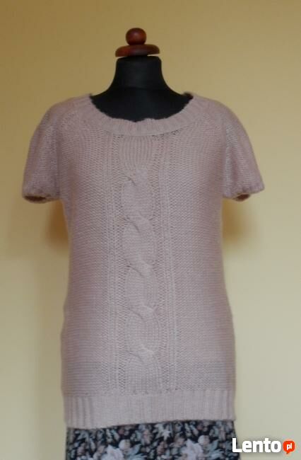 Oferuję sweterek w kolorze pudrowego różu. Sweterek ma krótkie rękawy, z przodu ozdobiony jest wzorem warkocza, z tyłu gładki.Rozmiar L.