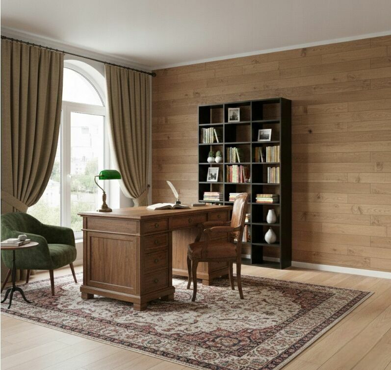 Mebel wyróżnia się unikalną kolorystyką – dębowy korpus i pionowe elementy doskonale komponują się z czarnymi, poziomymi półkami. Całość tworzy elegancki i nowoczesny wygląd, który pasuje do każdego salonu czy biura.