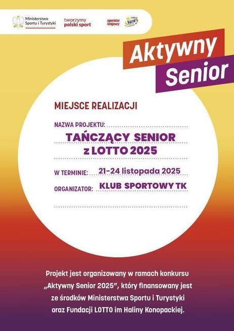 Zapraszamy na Wyjazdowe zajęcia taneczne \" Tańczący Senior z Lotto 2025\" w ramach konkursu MSiT \"Aktywny Senior 2025\" ...