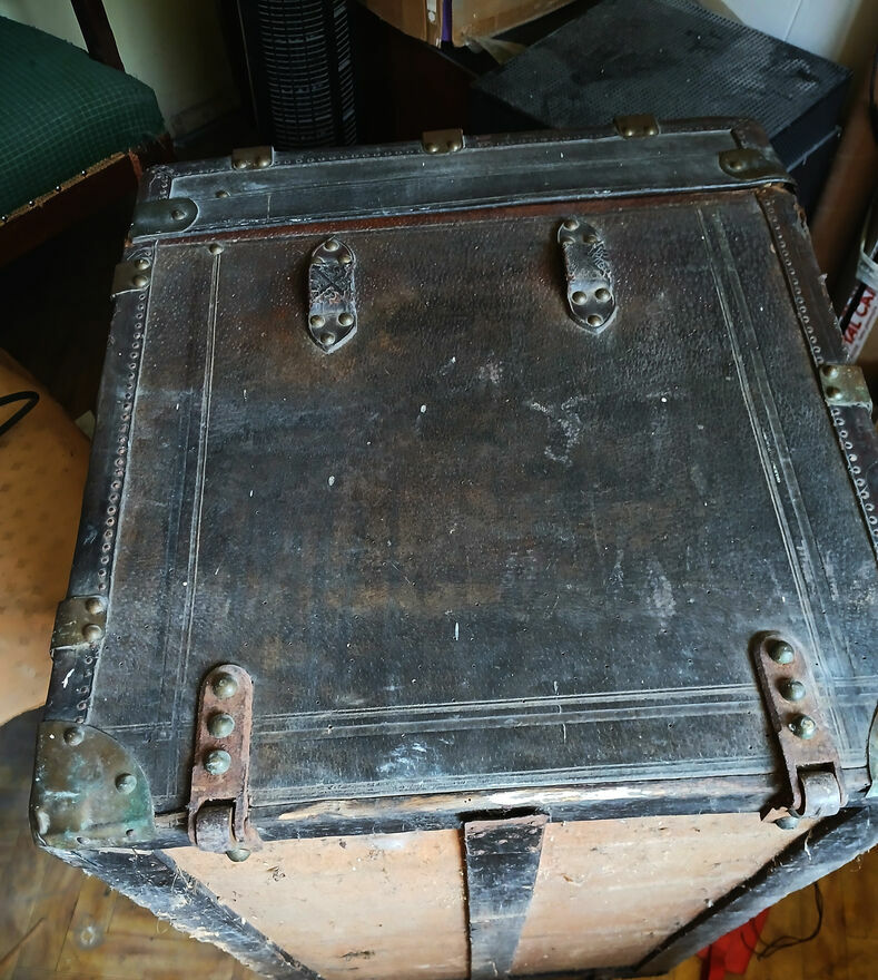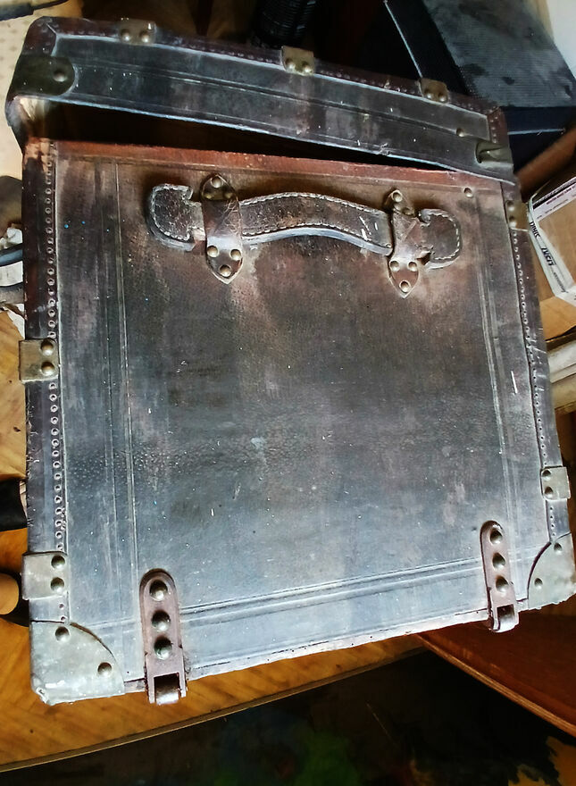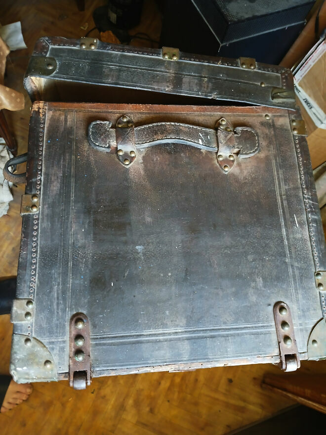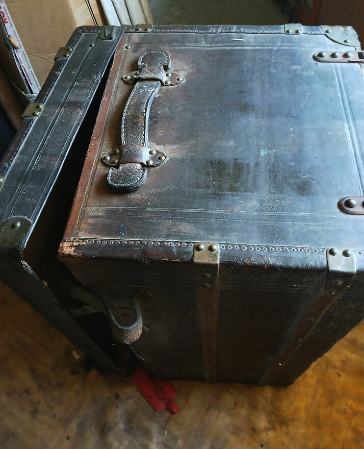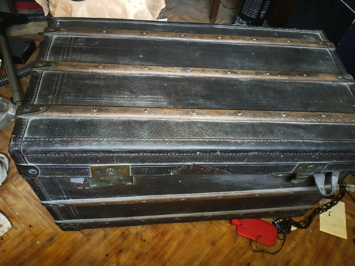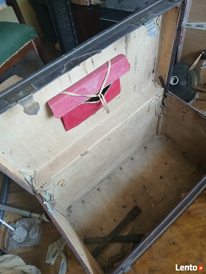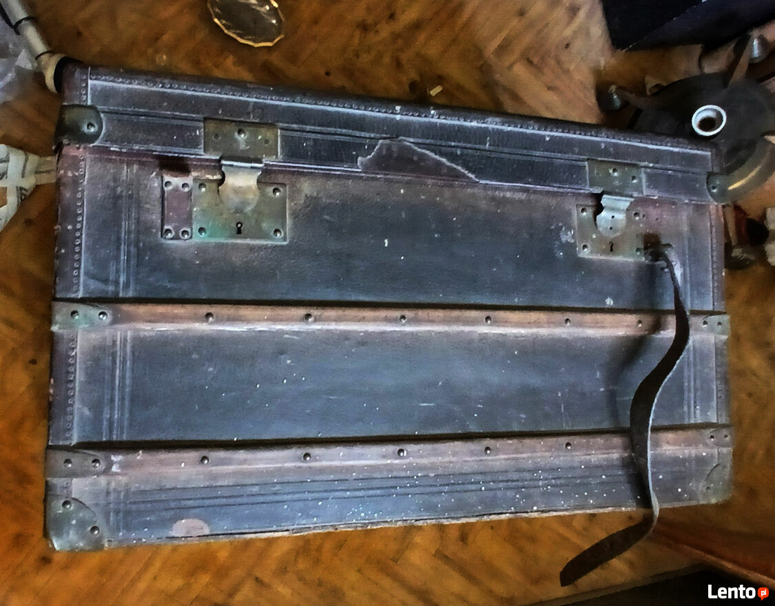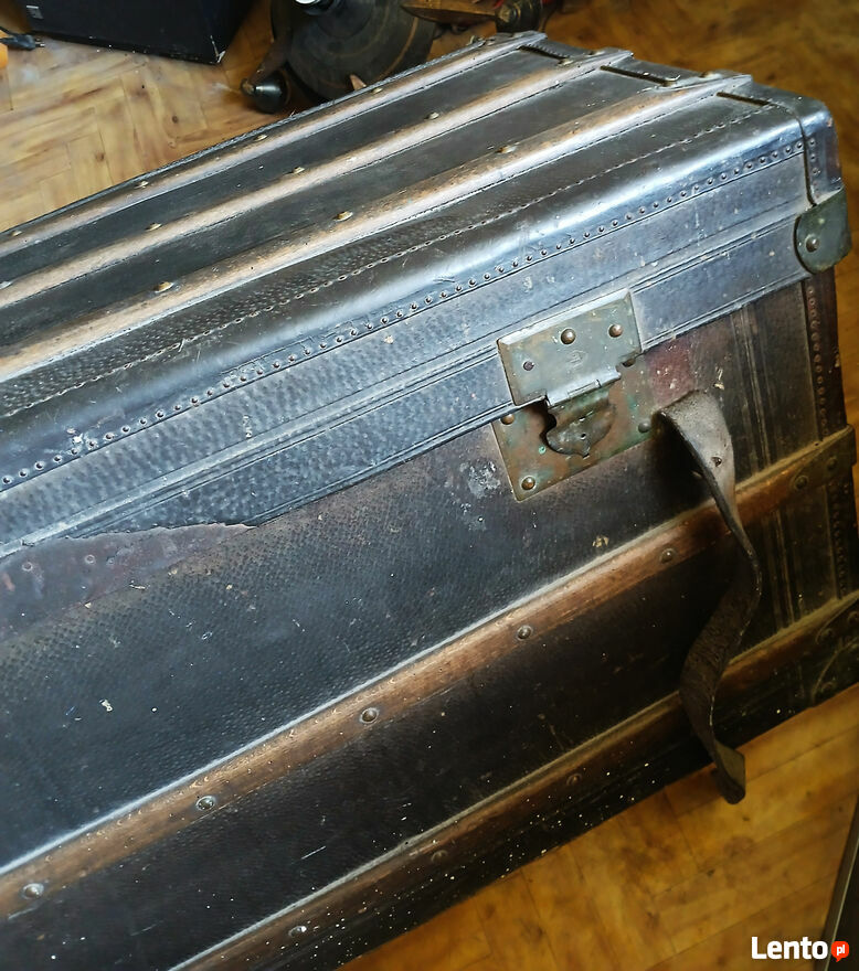 Kufer podróżny z końca XIX w Stan dobry biorąc pod uwagę wiek. Cały kufer jest licowany skórą nalepioną na drewnie. Zamki i okucia mosiężne. Na spodzie stalowe wzmocnienia z kółkami przydatnymi w transporcie. Skórzane pasy z których zachowała się jedynie część.Wymiary wysokość 48 cm szerokość 46 cm długość 86 cm