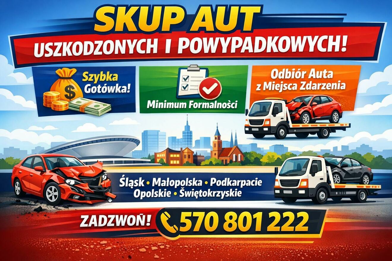 Masz samochód powypadkowy, uszkodzony mechanicznie lub zniszczony w wypadku i chcesz go szybko sprzedać? Nasza firma prowadzi profesjonalny skup samochodów uszkodzonych i powypadkowych na terenie Śląska, Małopolski, Podkarpackiego, Opolskiego i Świętokrzyskiego.Oferujemy pełen komfort sprzedaży auta bez konieczności jego naprawy czy stresujących formalności. Nasz proces jest szybki i przejrzysty: po kontakcie telefonicznym pod numerem 570 - pokaż numer telefonu - nasz ekspert umówi wycenę samochodu w dogodnym dla Ciebie terminie. Wycena jest bezpłatna i niezobowiązująca, a na jej podstawie otrzymujesz ofertę gotówkową.