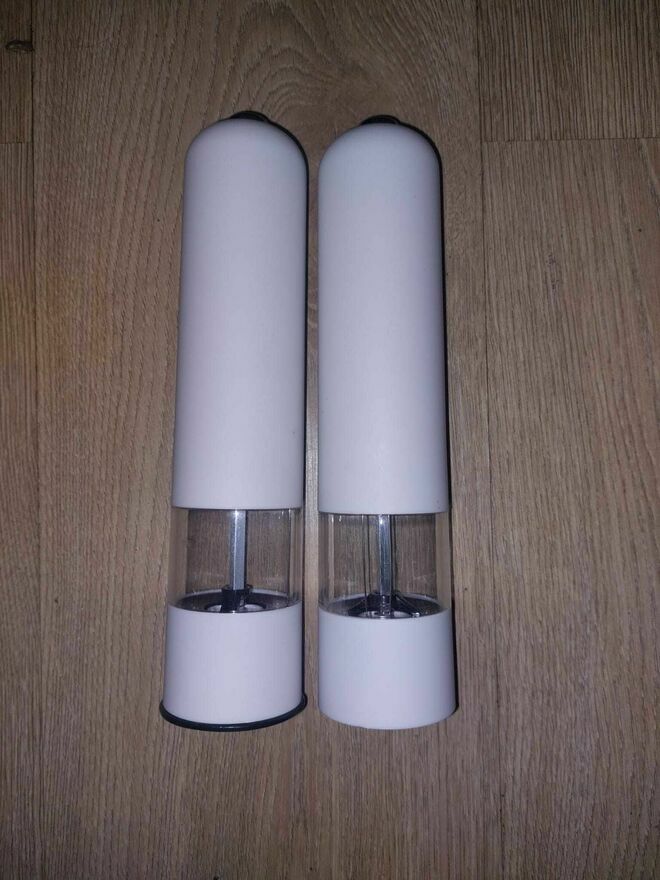 Witam, sprzedam dwa białe, elektryczne młynki do soli i pieprzu, zasilane bateriami.Posiadają przezroczystą komorę na przyprawy.