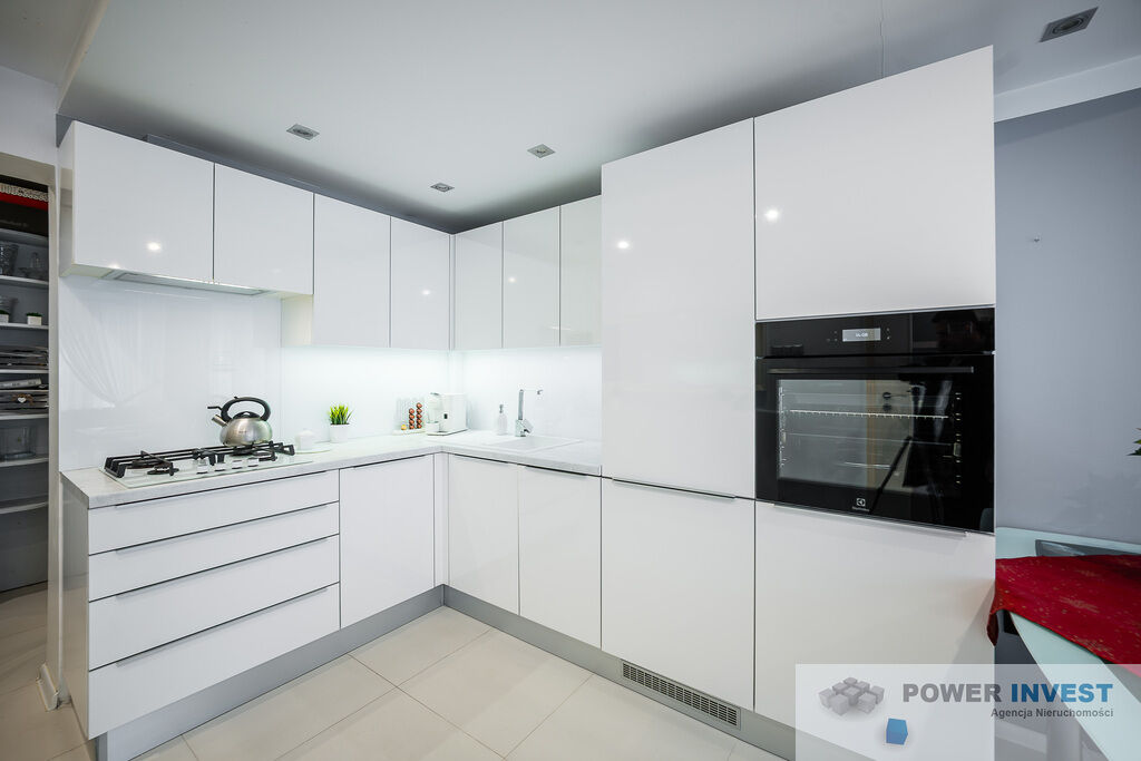 Kuchnia wyposażona jest w nowoczesną zabudowę na wymiar z dużą