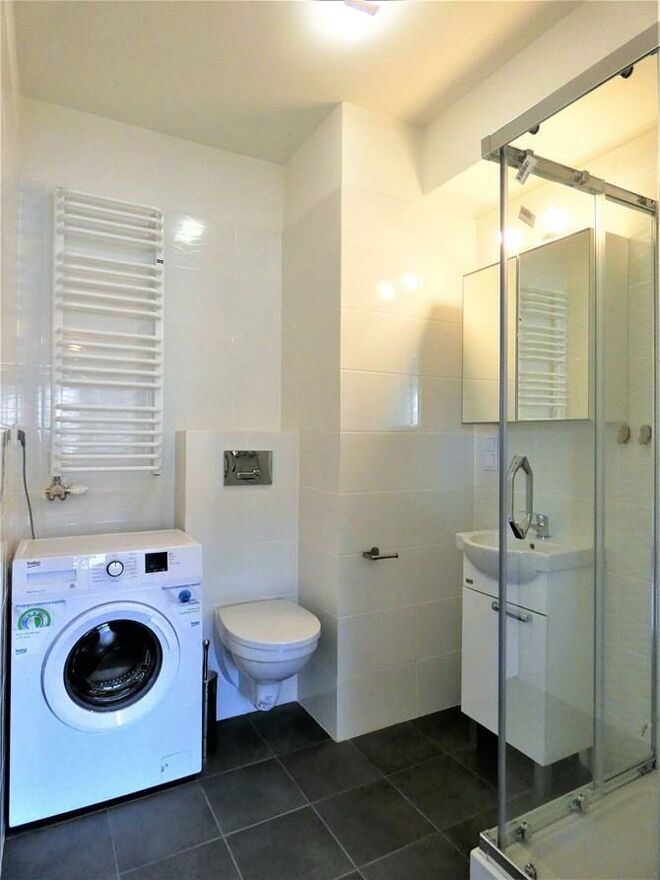 Łazienka: kabina prysznicowa, toaleta, umywalka, pralka, szafki.
