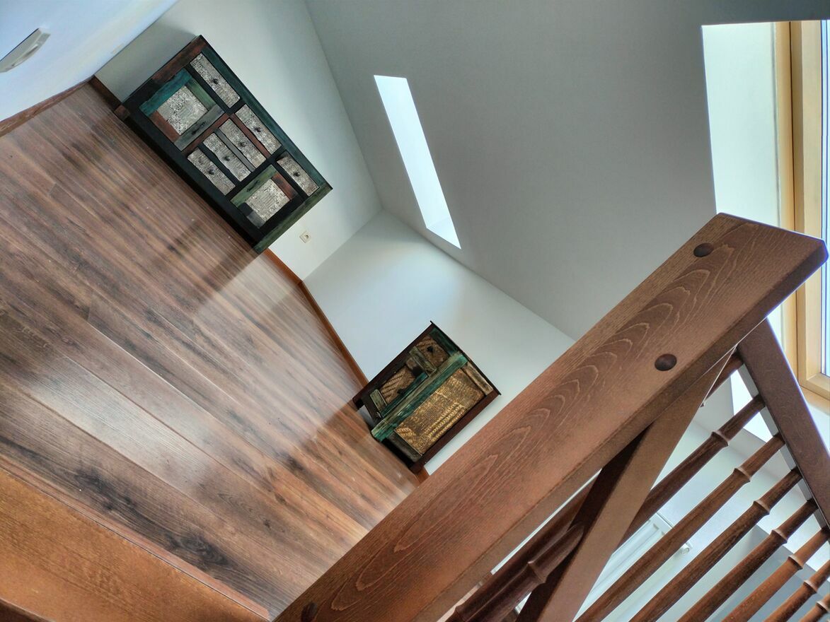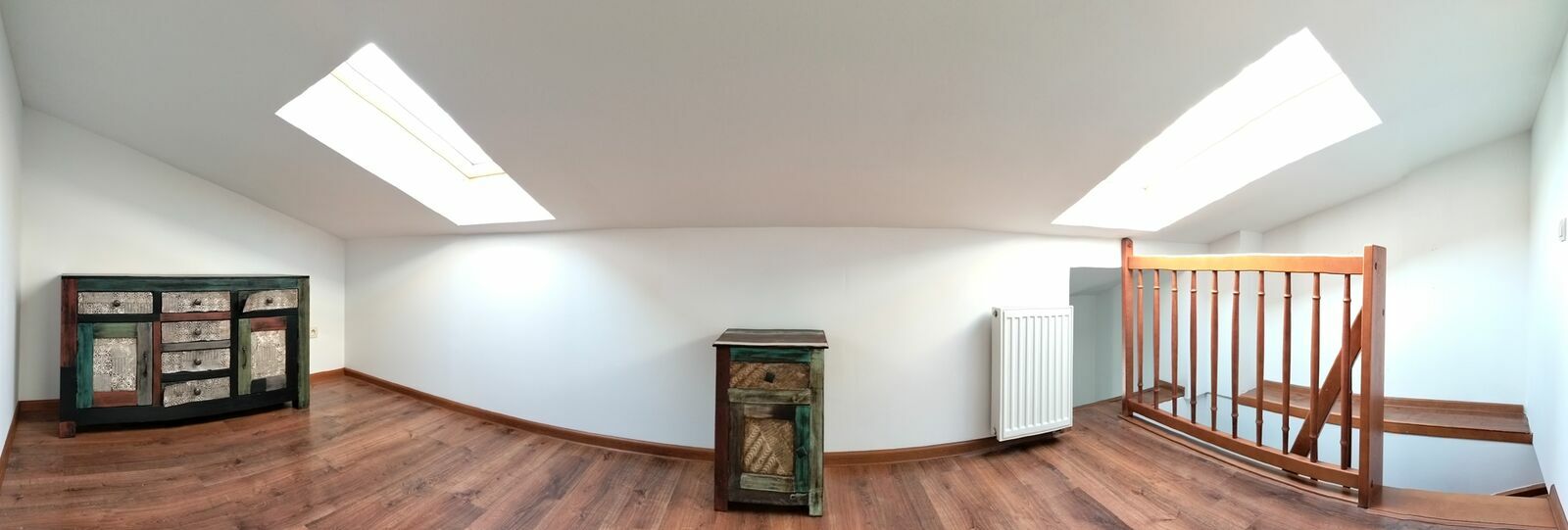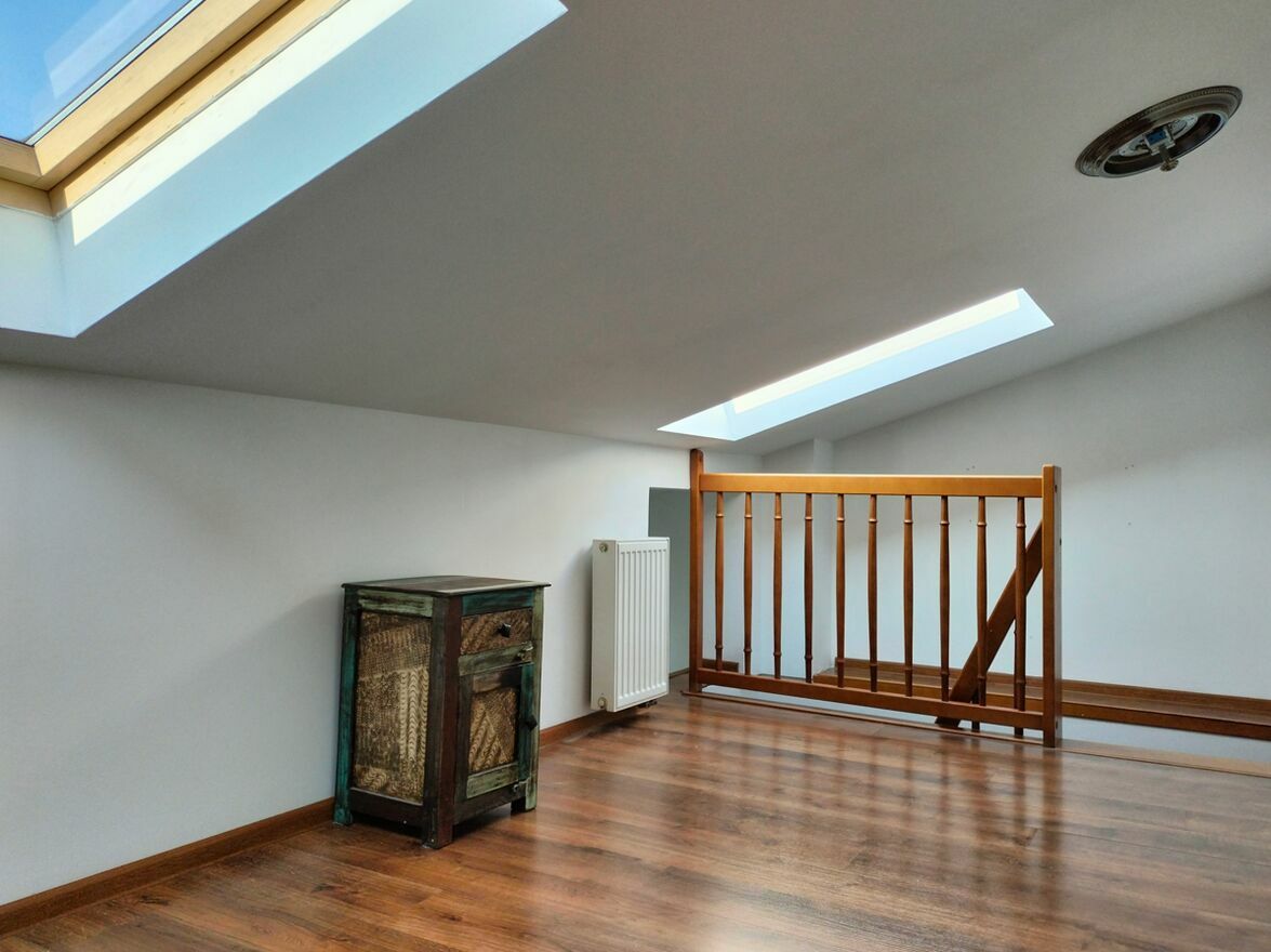 - Góra: antresola półzabudowana, pełniąca funkcję sypialni (ok. 12 m² po podłodze), z dwoma oknami dachowymi.