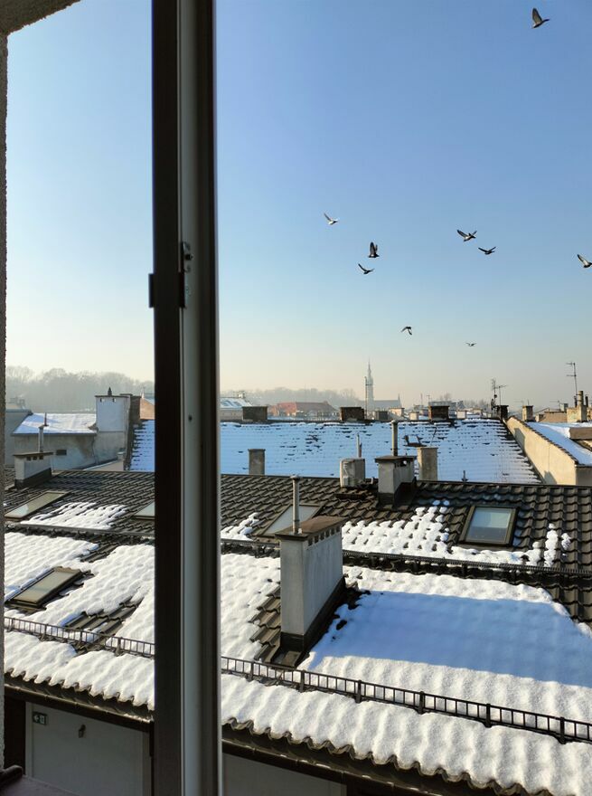 Wysoki sufit pomieszczenia dodaje mu przestronności. Dwa duże okna (od strony podwórza, nie ulicy) zapewniają dobre doświetlenie. Z okien rozpościera się malowniczy widok na dachy Podgórza, drzewa oraz wieżę zegarową kościoła św. Józefa, nad którą codziennie zachodzi słońce. Jest cicho.