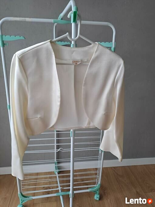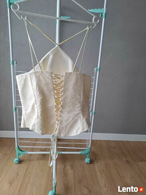 Sprzedam suknię ślubną złożoną z gorsetu i spódnicy. Dodatkowo gratis krótki welon na grzebieniu i bolerko3/4 w kolorze écru. Gorset wiązany z tyłu posiada możliwość bardzo dużej regulacji od 80 -120 cm obwodu klatki piersiowej. Długość całkowita gorsetu przód 47 cm, tył 31 cm (liczone bez ramiączek). Poniżej przybliżone rozmiary mierzone metrem krawieckim.Rozmiar blerko: 38.