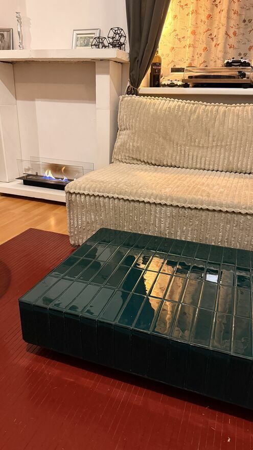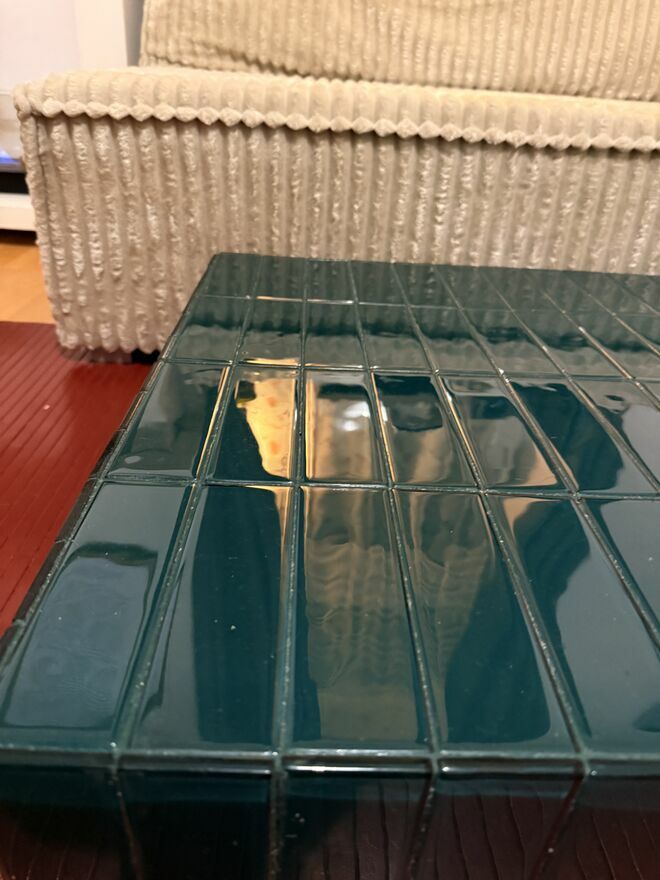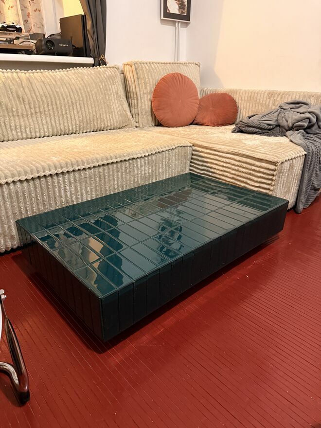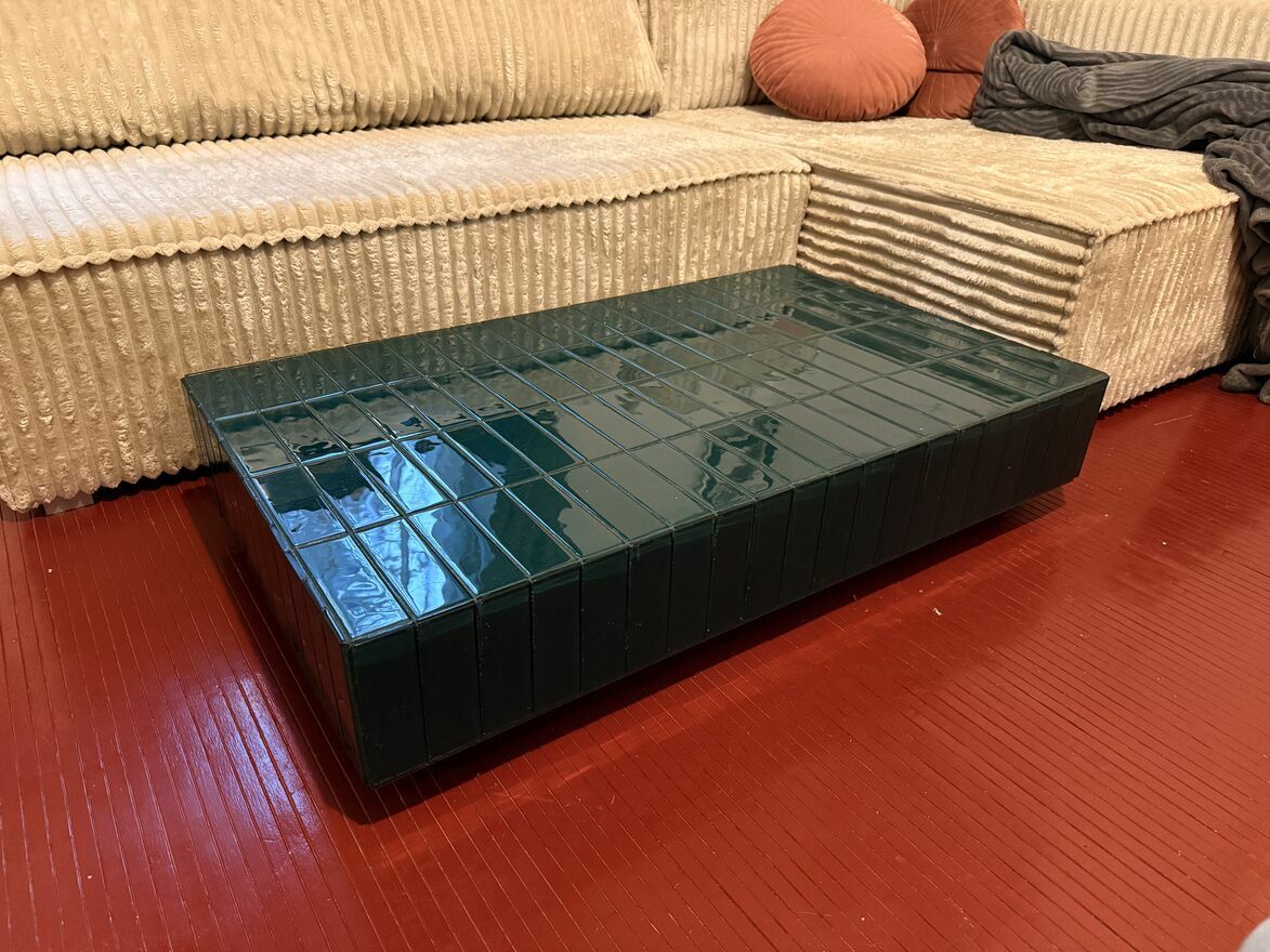 Elegancki stolik kawowy w kolorze emeraldowym z ozdobnymi płytkami. Idealny element wystroju salonu, który nada mu nowoczesny i stylowy charakter.Stolik ma wymiary 100cm na 60cm wysokoś 30cm z możliwością zamontowania wyższych nóżek