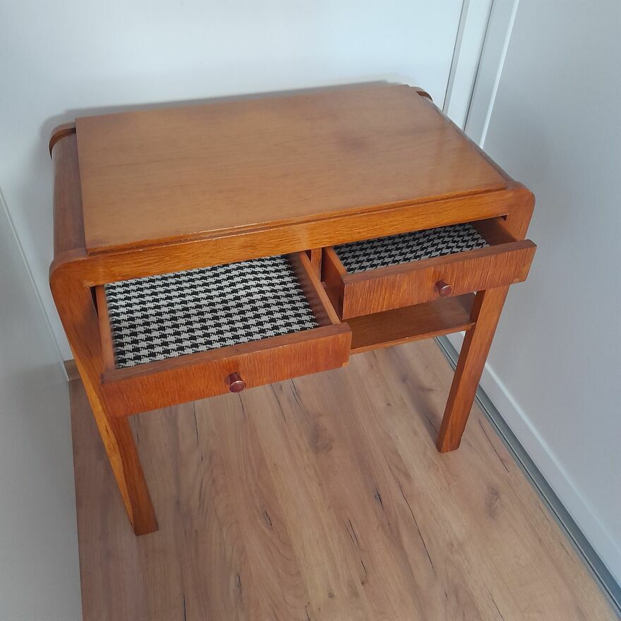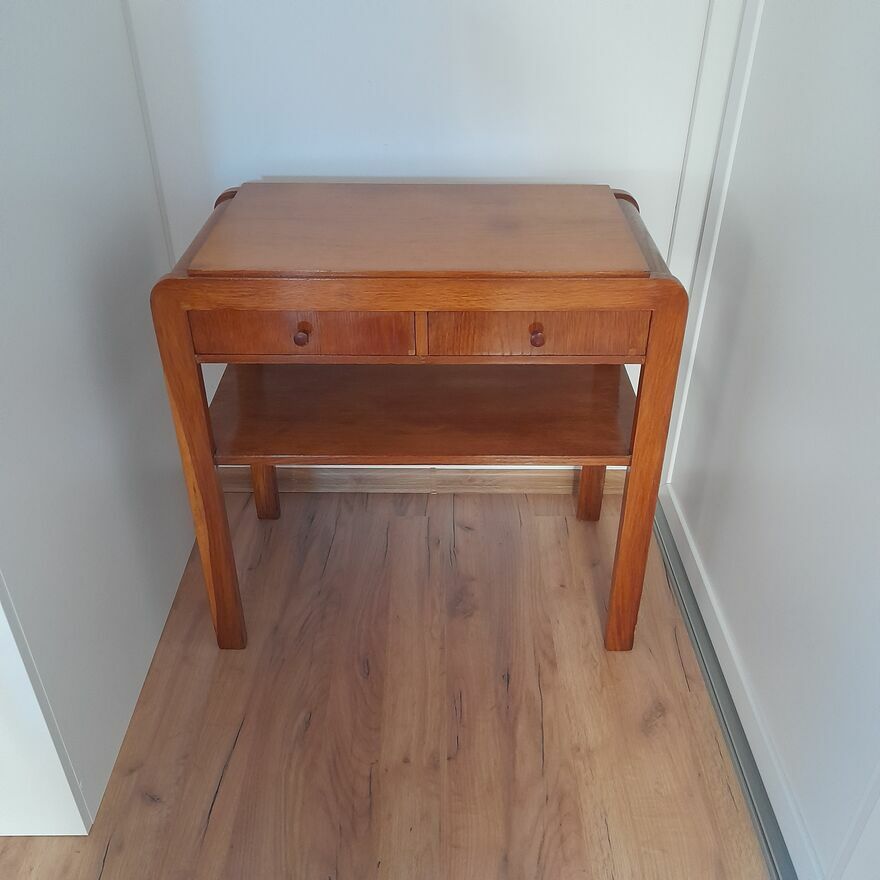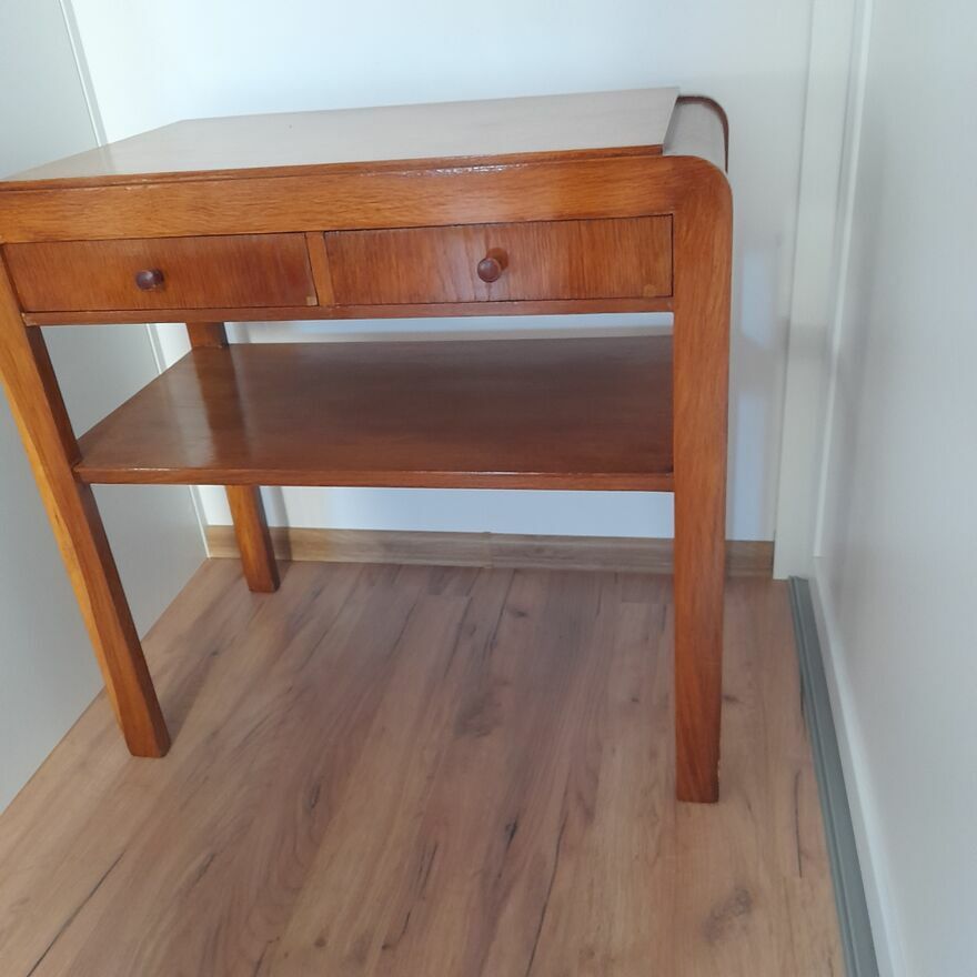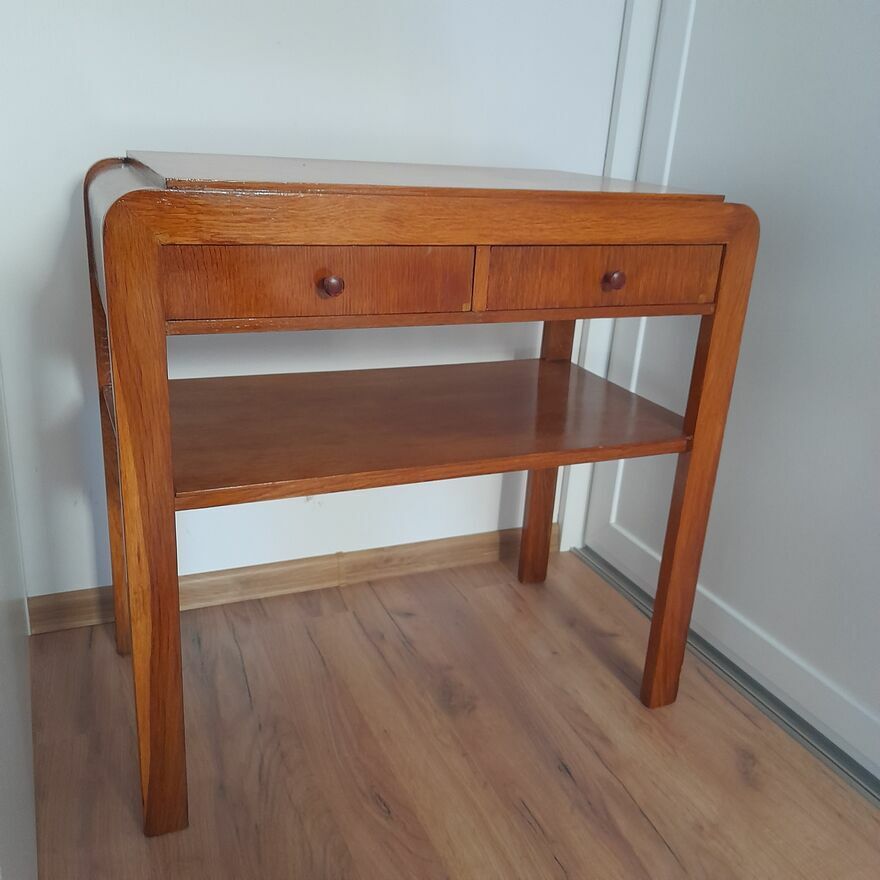Stolik ręcznie, estetycznie odnowiony położona profesjonalnie w całości politura, posiada dwie szuflady wyłożony estetyczną matą co podnosi charakteru - wszystko sprawne