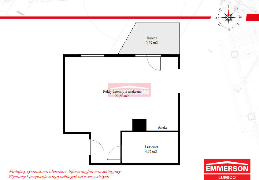 Przestronne studio z balkonem 5,5m2