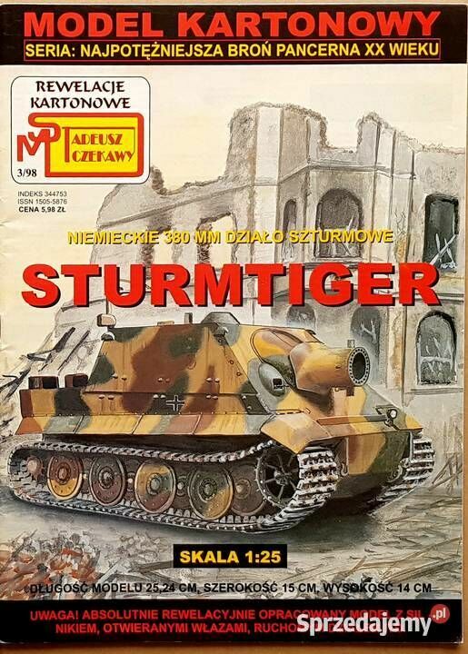 Zapraszam do zakupu wyjątkowego modelu Sturmtiger wydawnictwa SM Tadeusz Czekawy. Jest to jedna z perełek wśród kartonowych modeli, która z pewnością zachwyci każdego modelarza i kolekcjonera! Model: Sturmtiger Wydawnictwo: SM Tadeusz Czekawy Skala: 1:25 Wydany: 1998/1999 Stan: Nowy, oryginalnie zapakowany, kompletny zestaw Dlaczego warto? Detale: Model charakteryzuje się niezwykle precyzyjnym odwzorowaniem szczegółów i detali, które zadowolą nawet najbardziej wymagających modelarzy. Unikalność: Wydany przez renomowane wydawnictwo SM Tadeusz Czekawy, model ten to prawdziwa gratka dla pasjonatów historii i militarii. Wysoka jakość: Kartonowe elementy są łatwe do wycinania i sklejania, co zapewnia przyjemność z budowy oraz końcowego efektu. Rzadkość: Ze względu na wiek modelu, jest to egzemplarz, który zyskuje na wartości z każdym rokiem, będąc unikalnym elementem w kolekcji. Opis modelu: Sturmtiger to niemiecki czołg szturmowy z okresu II wojny światowej, wyposażony w potężną 380 mm armatę, zaprojektowany do niszczenia umocnionych pozycji przeciwnika. Jego konstrukcja i zastosowanie w działaniach bojowych budziły podziw wśród wojskowych. Dodatkowe informacje: W zestawie znajdziesz wszystkie niezbędne elementy: arkusze kartonowe, instrukcję oraz dodatkowe akcesoria, które pomogą Ci zbudować model o imponujących proporcjach. Model przeznaczony dla osób z doświadczeniem w modelarstwie kartonowym, ale również dla kolekcjonerów, którzy docenią jego wartość historyczną. Nie czekaj – to wyjątkowa okazja, aby wzbogacić swoją kolekcję o rzadki, wartościowy model! Zainteresowanych proszę o kontakt.Sprawdź zainteresowanie tym ogłoszeniem