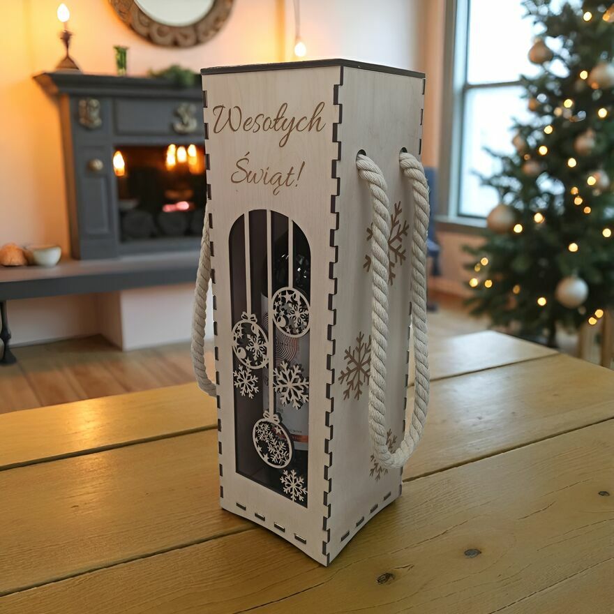 Elegancka skrzynka na wino wykonana z naturalnej sklejki brzozowej 3 mm to wyjątkowe opakowanie, które podkreśli charakter każdego prezentu.Świąteczne zdobienia nadają jej ciepły, bożonarodzeniowy klimat, a solidne sznurkowe uchwyty ułatwiają przenoszenie.