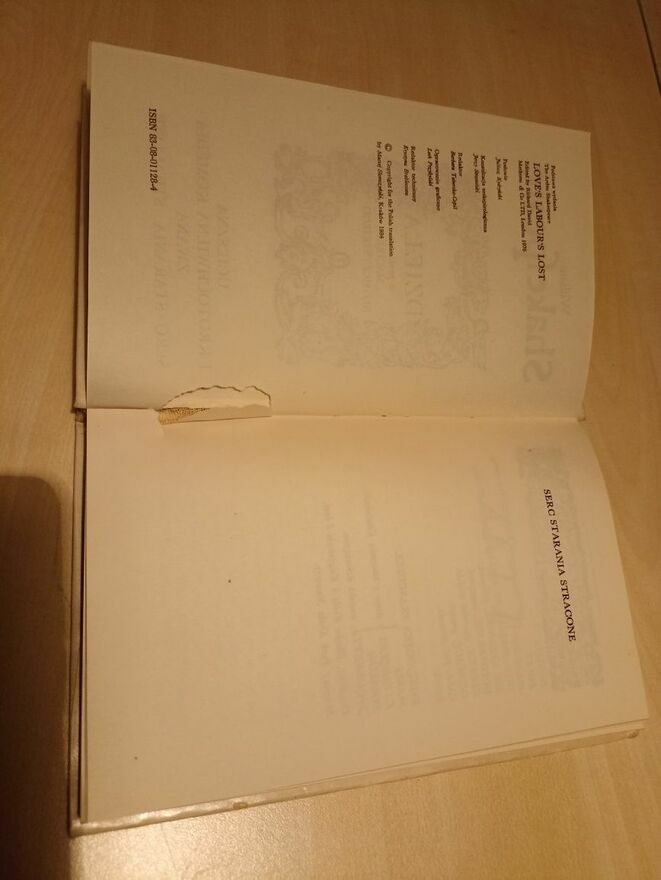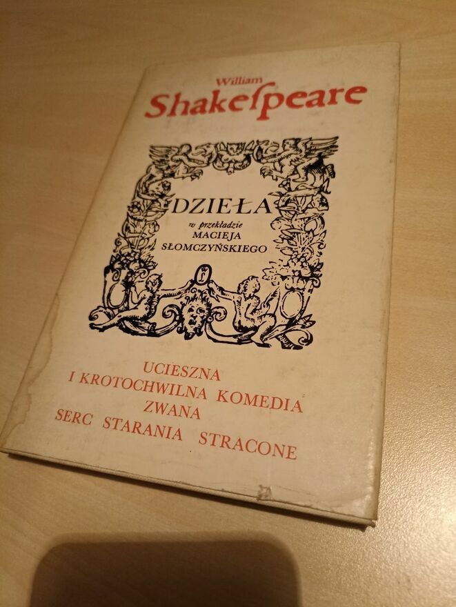 Sprzedam książkę Williama Szekspira "Ucieszna i krotochwilna komedia zwana serc starania stracone"Stan średni - kilka kartek uszkodzone i plama na obwolucie.