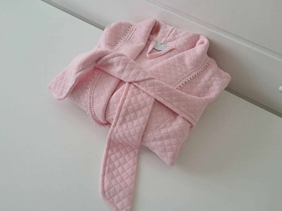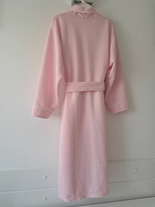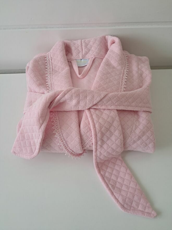 Do sprzedania różowy, bawełniany (100%) szlafrok damski „SOVIE”, rozmiar XL. Wokół kołnierza, na rękawach i dwóch kieszeniach koronkowa aplikacja, wewnątrz wiązanie, na zewnątrz pasek na dwóch szlufkach. Wymiary w cm: szerokość w ramionach – 51, obwód pod pachami – 116, na dole – 134, długość całkowita – 110, długość rękawa: zewnętrzna – 50, od pachy - 45.Szlafrok mało używany w bardzo dobrym stanie.