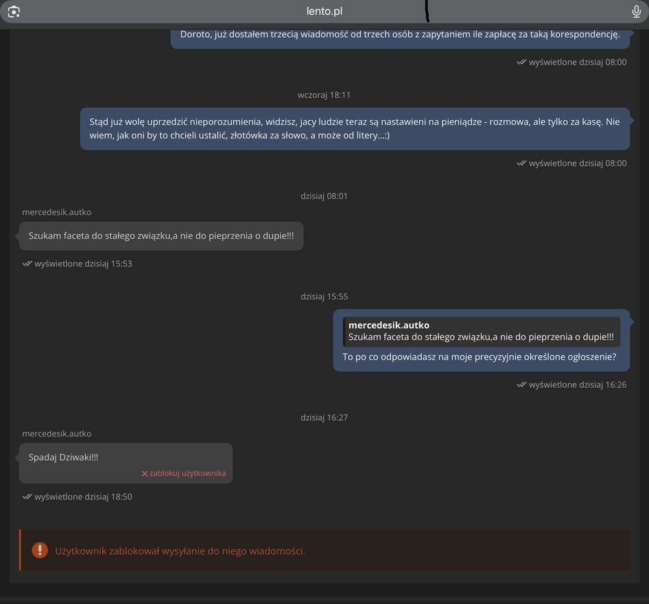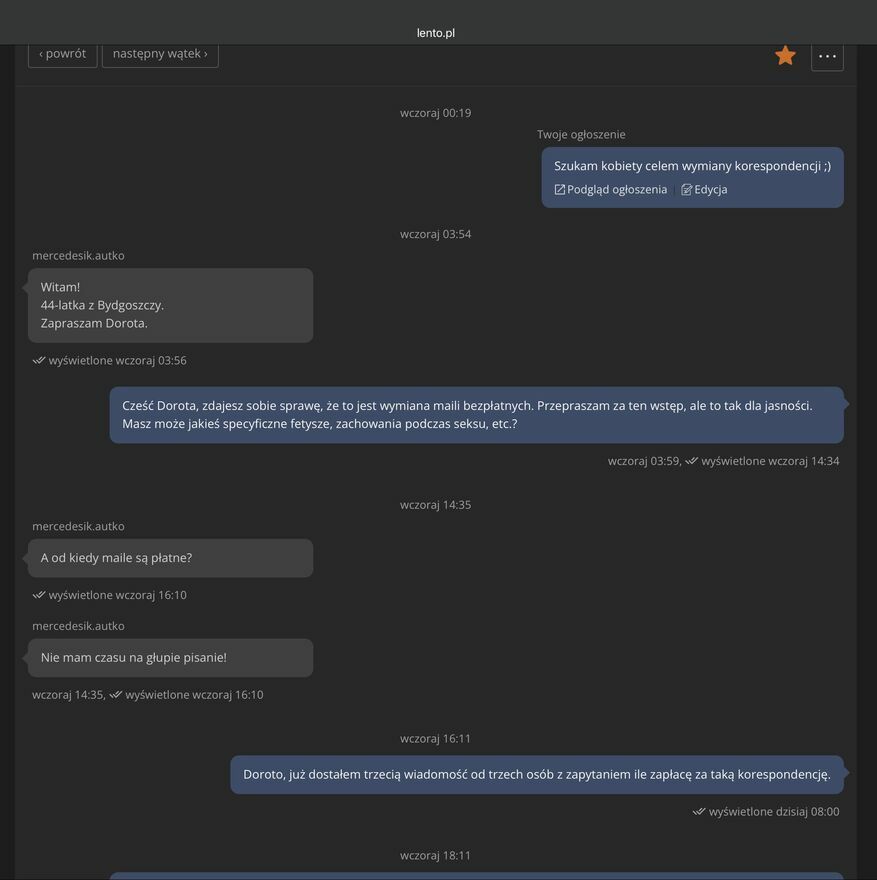 Jeśli masz bujną wyobraźnię, a nie masz możliwości spełnienia swoich najskrytszych nawet fantazji, to dobrze trafiłaś. Nie jesteś sama. Mam podobny problem. Listów w próżnie nie będę wysyłał. Przydałby się ktoś zaufany, kto wysłucha, mało tego, podsyci te Twoją fantazje własnymi. Wszystko całkowicie niezobowiązujące. Możesz przerwać w każdym momencie. Od Ciebie również zależy, jak to się wszystko potoczy. Masz kontrolę (chyba że nie lubisz kontrolować - to też da się załatwić). Czekam na Ciebie i Twoje słowa z utęsknieniem. Ja, 45 lat, 180 wzrosty, reszta w korespondencji.W 2 ostatnich załącznikach, ktoś, kto raczej miałby problem z logiką wypowiedzi.