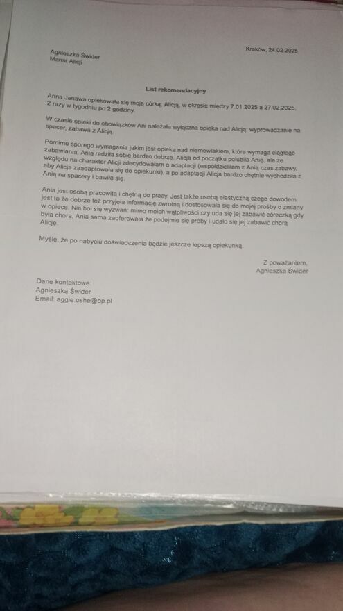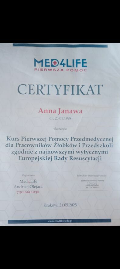 Uwielbiam bardzo pracę z dziećmi oraz opiekę nad nimi, mam z nimi bardzo dobry kontakt,dzieci też mnie bardzo lubią i same do mnie lgną.Interesuje mnie rozwój dzieci oraz pielęgnacja ,lubię obserwować jak dzieci się rozwijają, rosną i robią postępy.Praca z dziećmi mnie uszczęśliwia i daje mi radości dużo , traktuje ją jako misję i powołanie. . Mam aktualny kurs pierwszej pomocy.Mam też certyfikaty z różnych kursów.Posiadam także referencje z pracy jako niania oraz z pracy w żłobku .