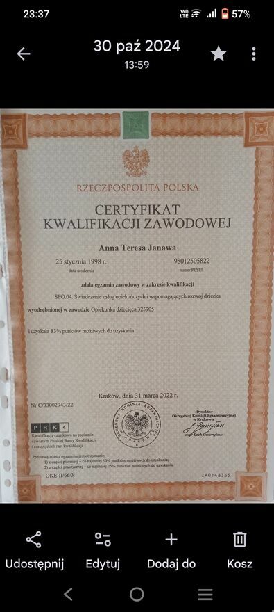 Szukam pracy jako opiekunka w żłobku lub niania albo pomoc w przedszkolu od zaraz.Mam doświadczenie w pracy w żłobku i skończyłam 2 letnią szkołę policealna na opiekunkę dziecięca , która dała mi kwalifikacje do pracy .