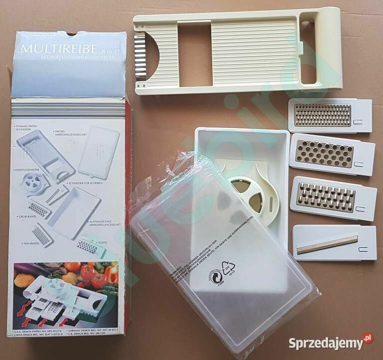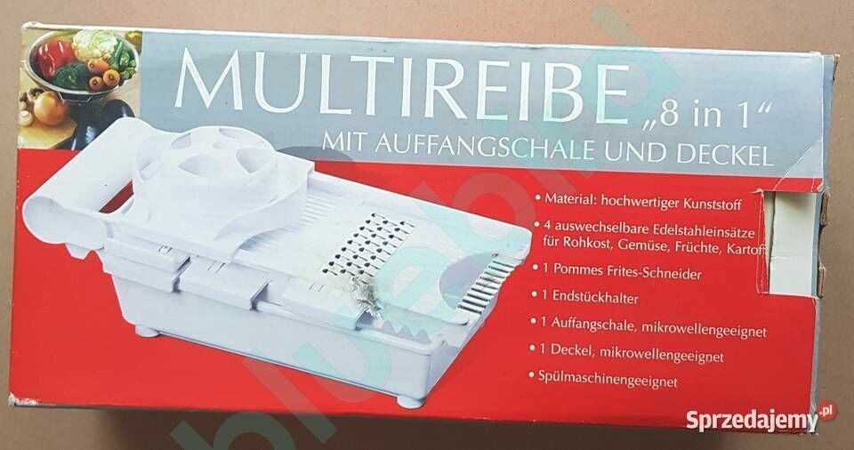 Tarka / Szatkownica MULTIREIBE 8w1 – Zestaw Kuchenny z Wymiennymi Ostrzami Na sprzedaż kompletny, zestaw kuchenny MULTIREIBE 8w1 – idealny do szybkiego i wygodnego krojenia, tarcia i szatkowania warzyw oraz owoców. W zestawie znajdują się wymienne ostrza, pojemnik z pokrywką i popychacz – wszystko w oryginalnym opakowaniu. Zestaw zawiera: - główna tarka z uchwytem, - pojemnik do zbierania składników (nadający się do mikrofalówki), - 5 wymiennych ostrzy: do frytek, plasterków, cienkiego tarcia, grubego tarcia i szatkowania, - popychacz zabezpieczający palce, - pokrywka do pojemnika. Cechy produktu: + łatwe i szybkie przygotowanie posiłków, + wymienne ostrza ze stali nierdzewnej, + wszystko można umyć w zmywarce, + kompaktowy i lekki – idealny do każdej kuchni. Stan: kompletny zestaw z oryginalnym opakowaniem.Sprawdź zainteresowanie tym ogłoszeniem