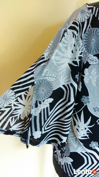 Oferuję top marki New Look w czarno-biały wzór. Dekolt w formie „wody”. Rękaw rozszerzony, rozcięty, z pęknięciem na ramieniu. Stan bardzo dobry – normalne ślady użytkowania.Rozmiar z metki L.