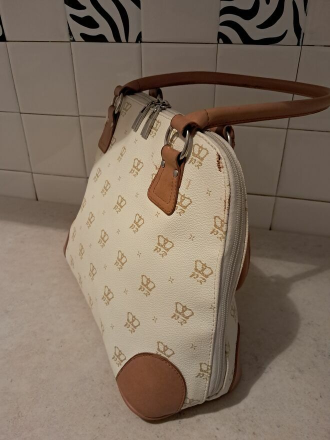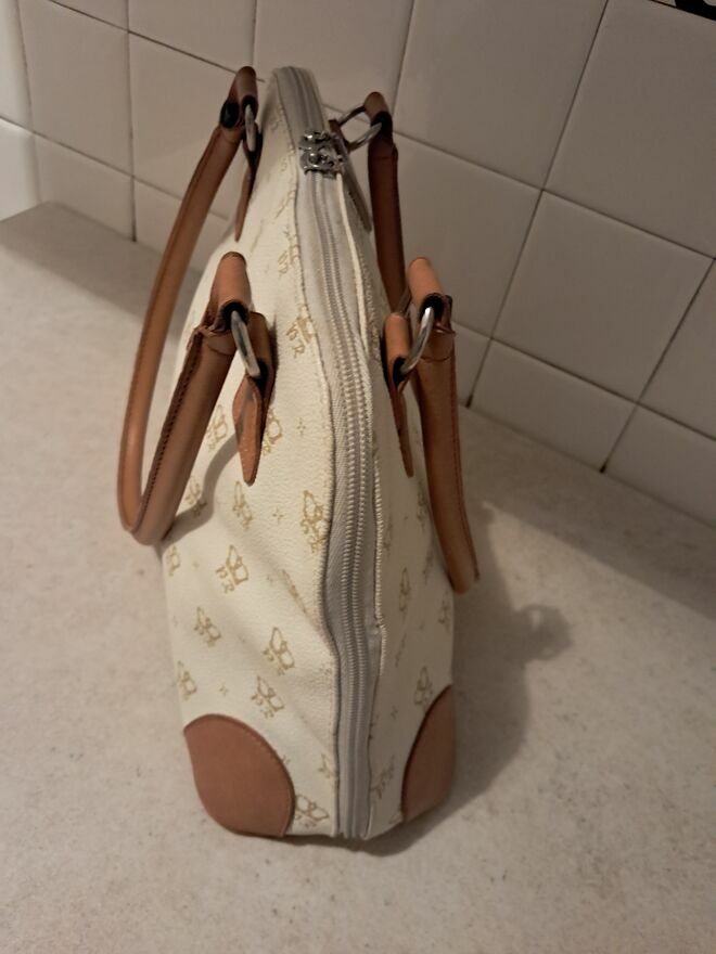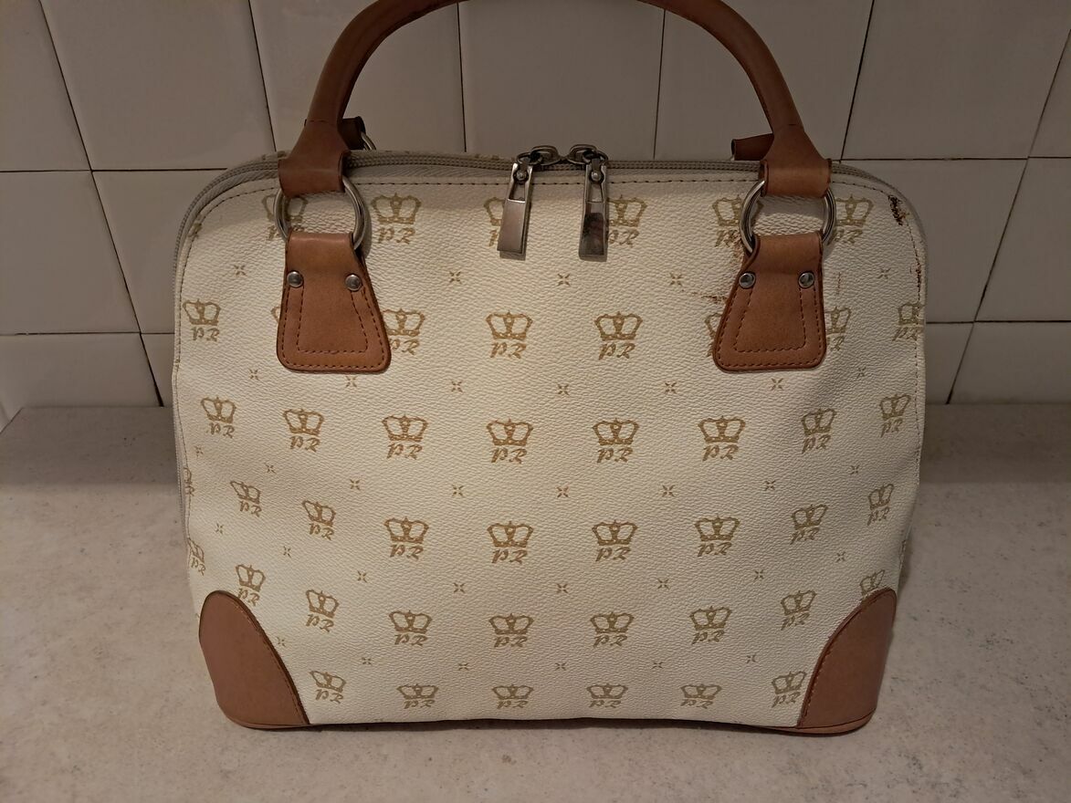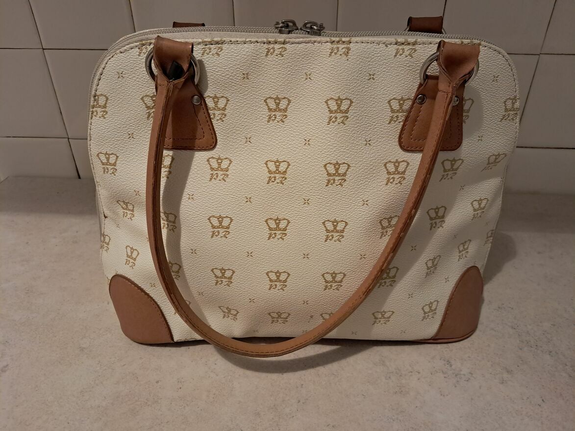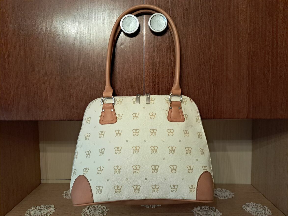 Do sprzedania elegancka kremowa torebka damska „PR”, ze skóry ekologicznej, zapinana na dwustronny suwak, z brązowymi uszami o długości 52 cm i brązowymi elementami na rogach. Wewnątrz podszewka i dwie kieszonki, w tym jedna zamykana na suwak. Uchwyty suwaków i okucia srebrne. Wymiary w cm (wysokość x szerokość x głębokość): 24 x 33 x 12.Torebka mało używana, w znakomitym stanie.