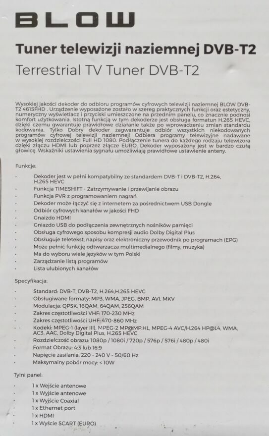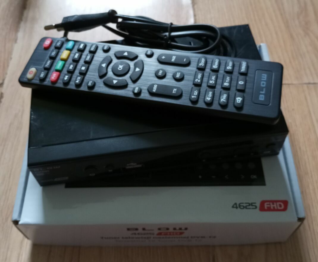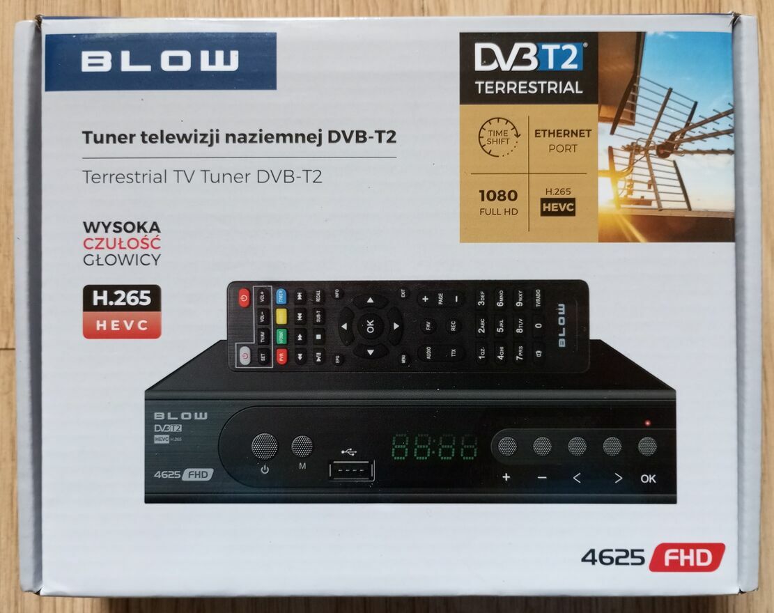 Tuner DVBT2 Blow, pilot zdalnego sterowania, instrukcję obsługi po polsku, oryginalne opakowanie.