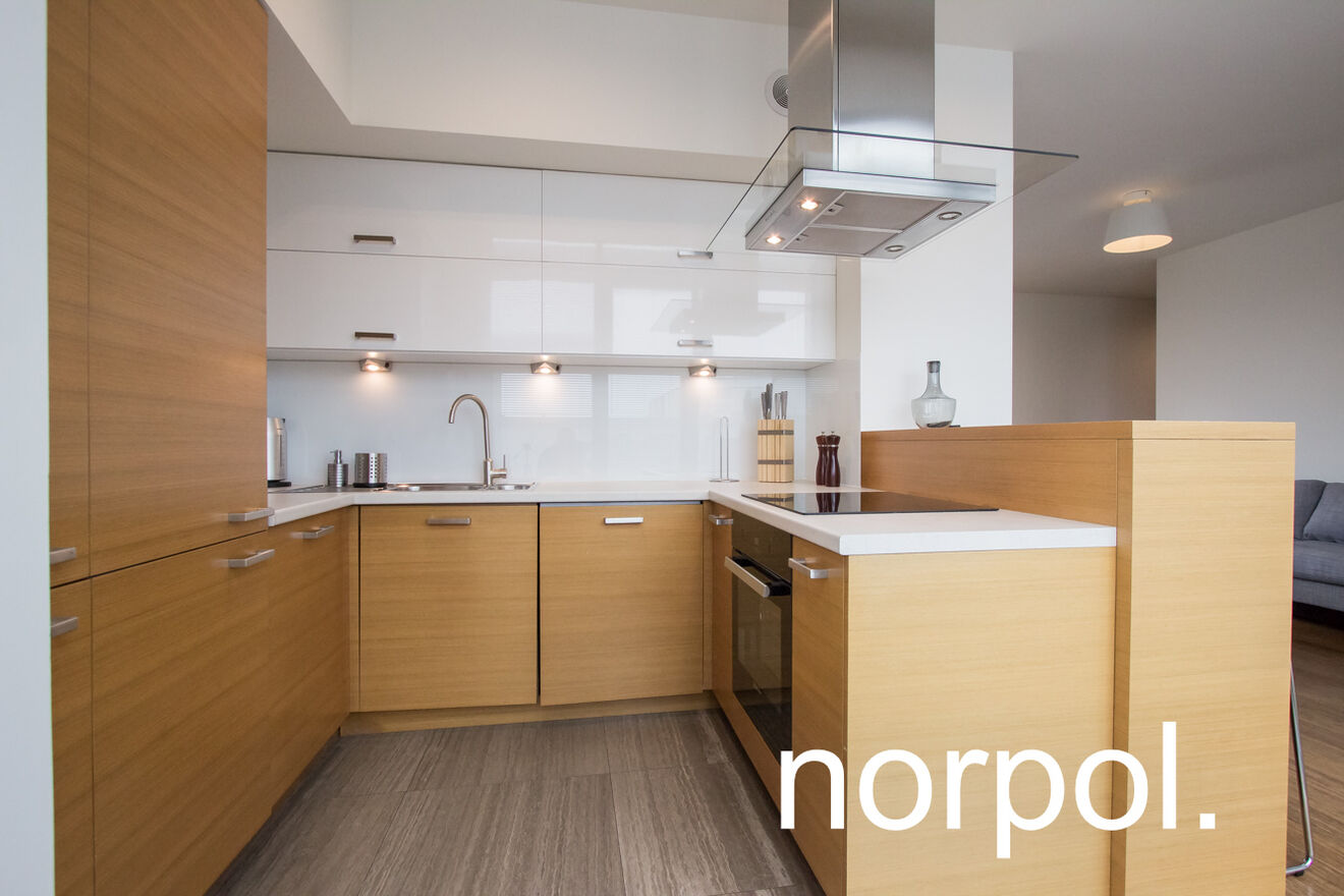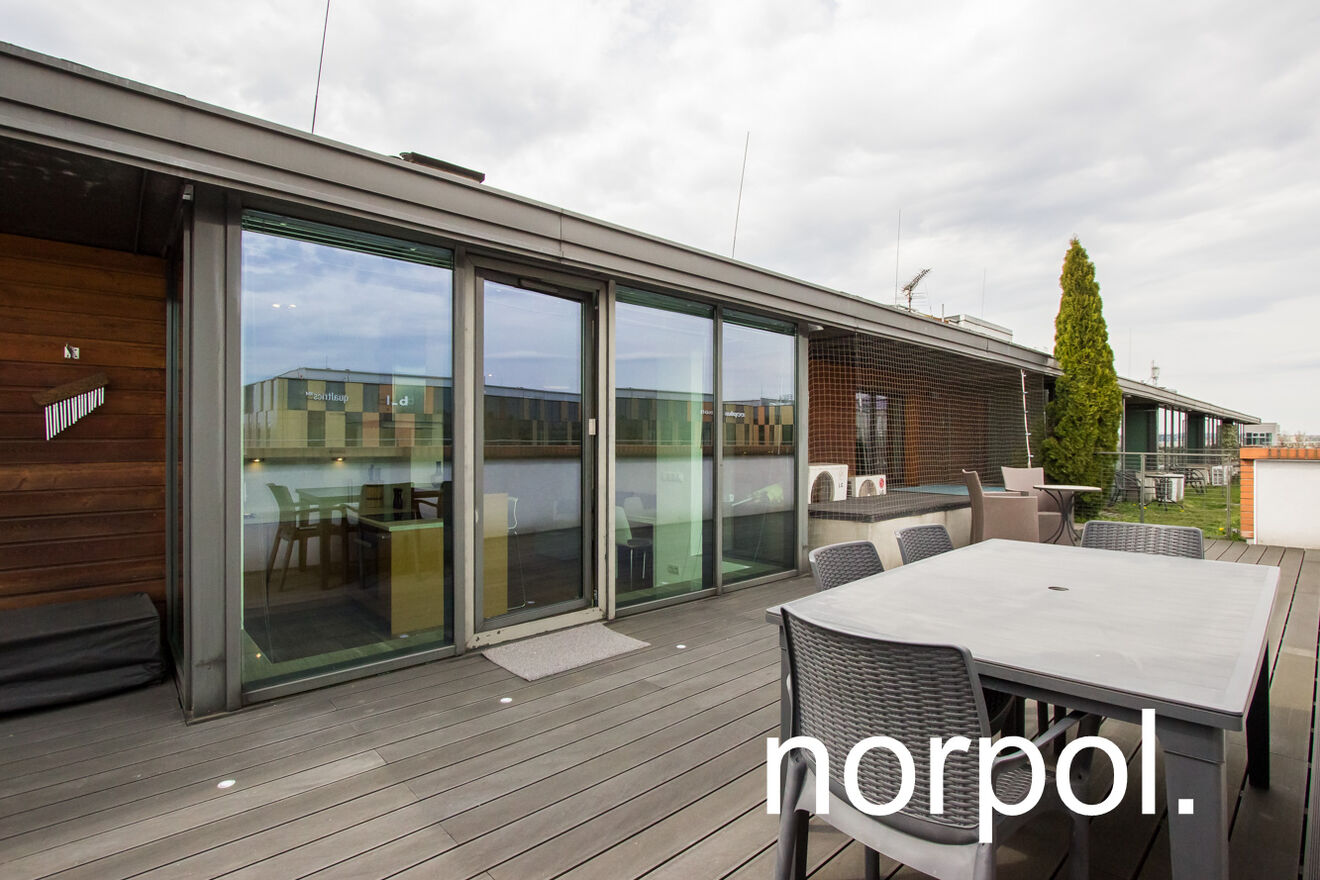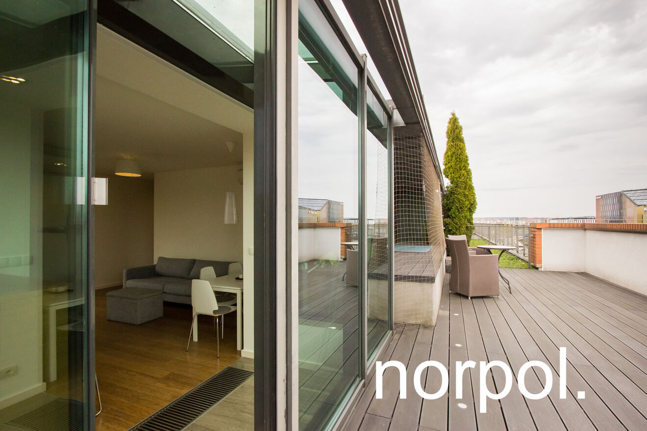 Apartament składa się z salonu połączonego z nowoczesnym aneksem kuchennym, 2 sypialni, łazienki przedpokoju oraz 70 metrowego prywatnego tarasu. Klimatyzacja zapewnia komfortowy klimat przez cały rok, a taras wyłożony deskami otacza cały apartament oraz jest idealnie usytuowany – na najwyższym piętrze na końcu budynku, z pięknym widokiem na Stare Miasto. Apartament w pełni wyposażony i umeblowany.