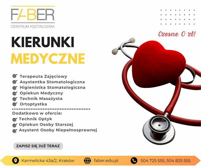 Faber Centrum Kształcenia zaprasza do zapisów na kierunki medyczne. Nie mamy czesnego, a zajęcia się odbywają w weekendy ...
