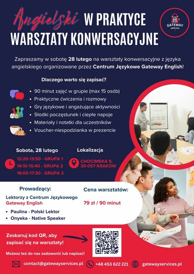 W sobotę 28 lutego dołącz do warsztatów organizowanych przez Centrum Językowe Gateway English, prowadzonych przez Paulinę - polskiego lektora i Onyekę - native speakera! Zajęcia dla dorosłych i młodzieży od 16 lat, pełne aktywnych konwersacji i integracji.