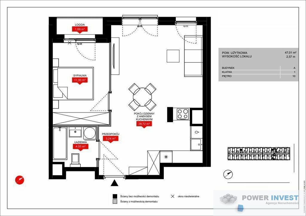 - Powierzchnia: 47,01 m² — odpowiednia dla singla, pary lub jako