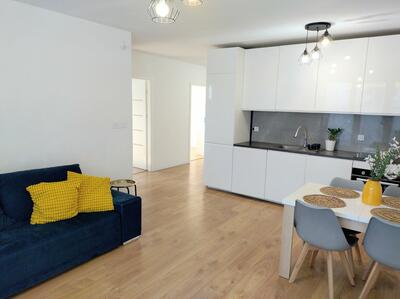 Dwa jasne umeblowane pokoje dla 4 osób, jasna duża kuchnia z jadalnią z dużą lodówką, łazienka z kabiną, osobne ...
