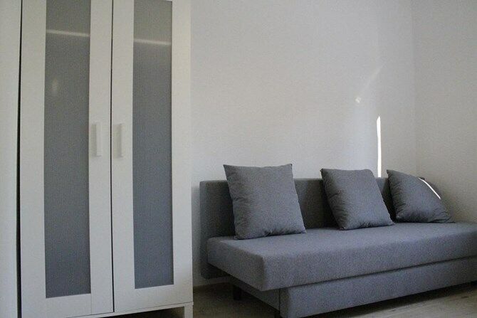 Pokój: rozkładana sofa, pojemna szafa, biurko.