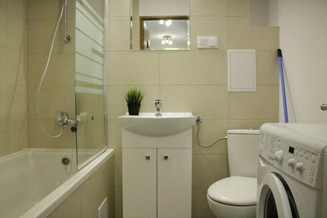Łazienka: umywalka z funkcją toaletki, WC, wanna, pralka.