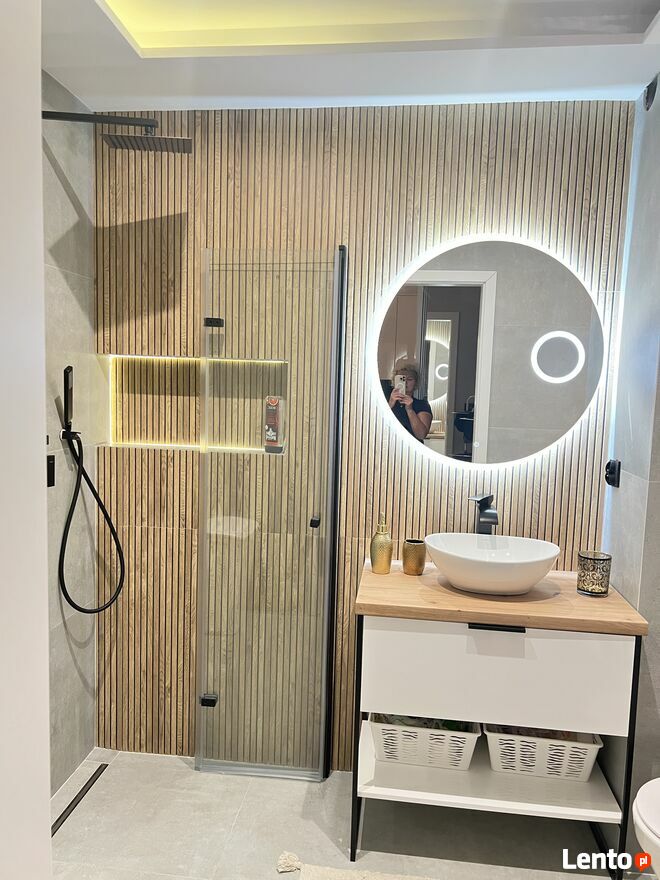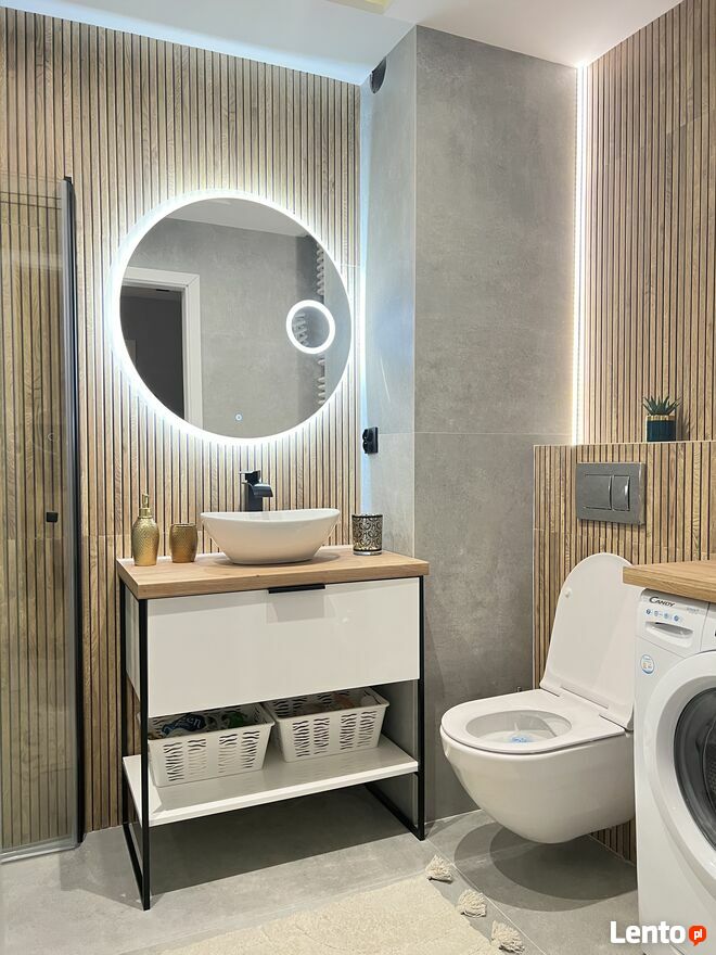 Przestronnej łazienki w pełni wyposażonej w prysznic, toaletę, umywalkę, pralkę.