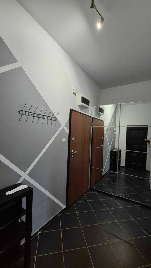 • Przedpokoju z miejscem na przechowywanie i bardzo pojemną szafą z lustrem.