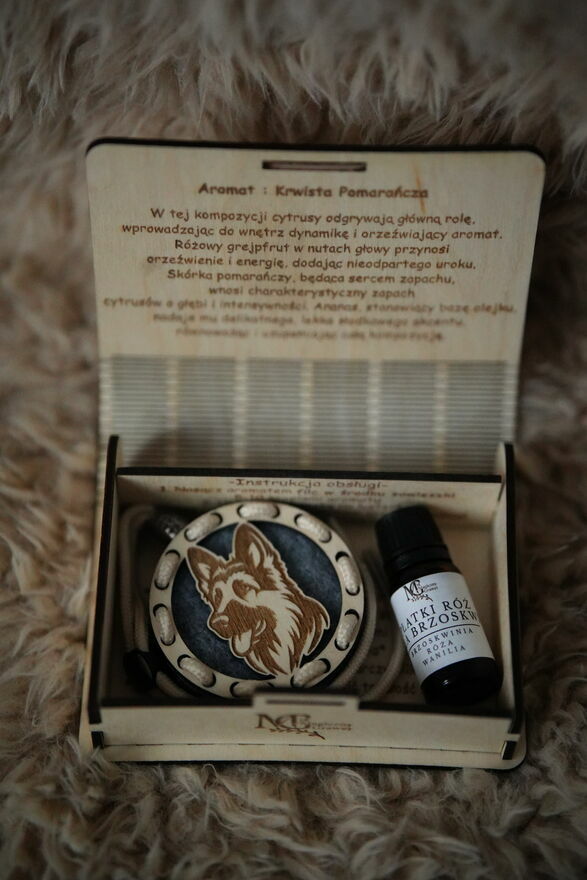 W zestawie otrzymujesz : Drewniane pudełeczko w którym znajduję się drewniana zawieszka oraz 10ml wydajnego olejku zapachowego