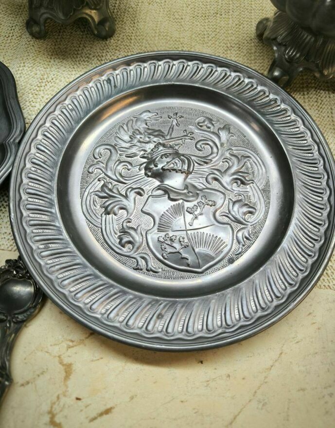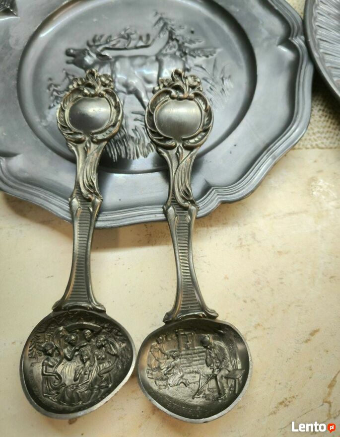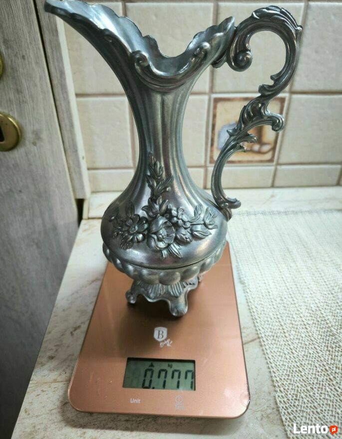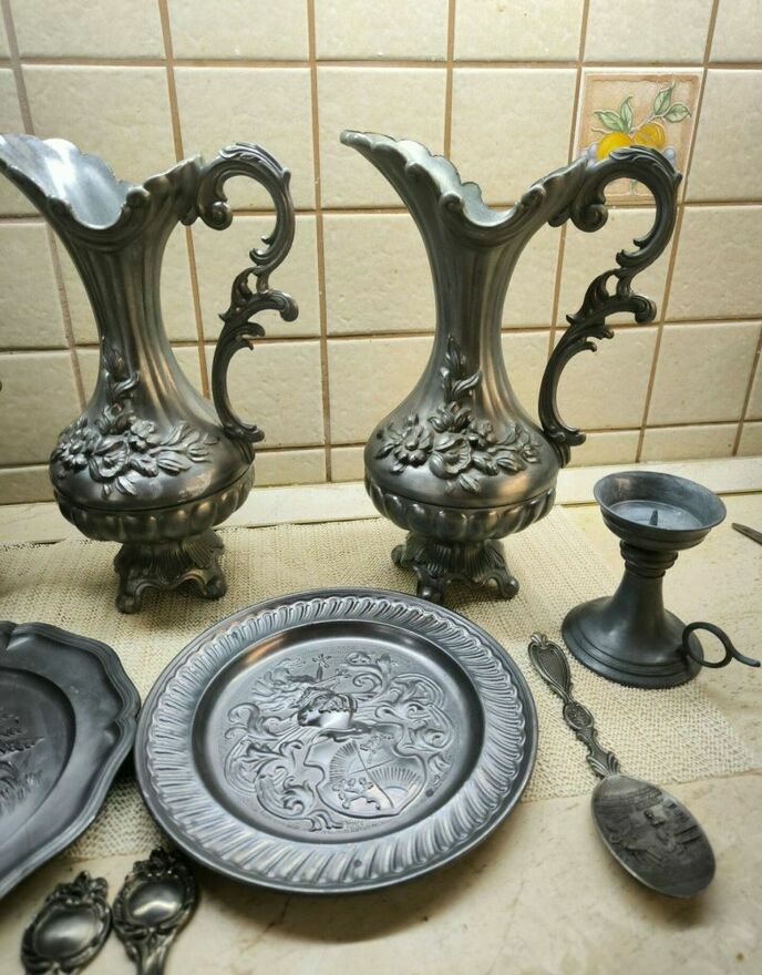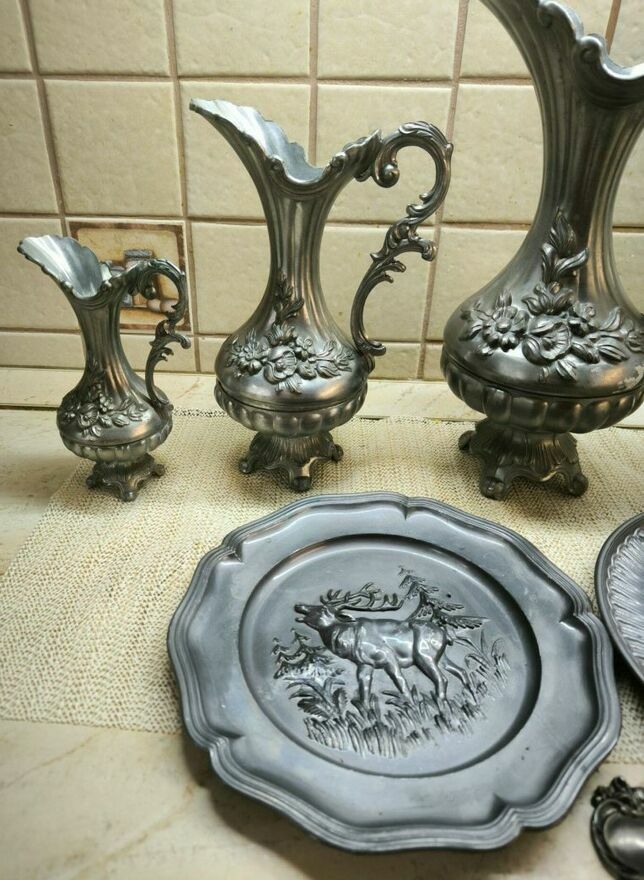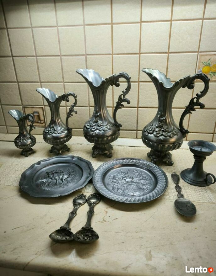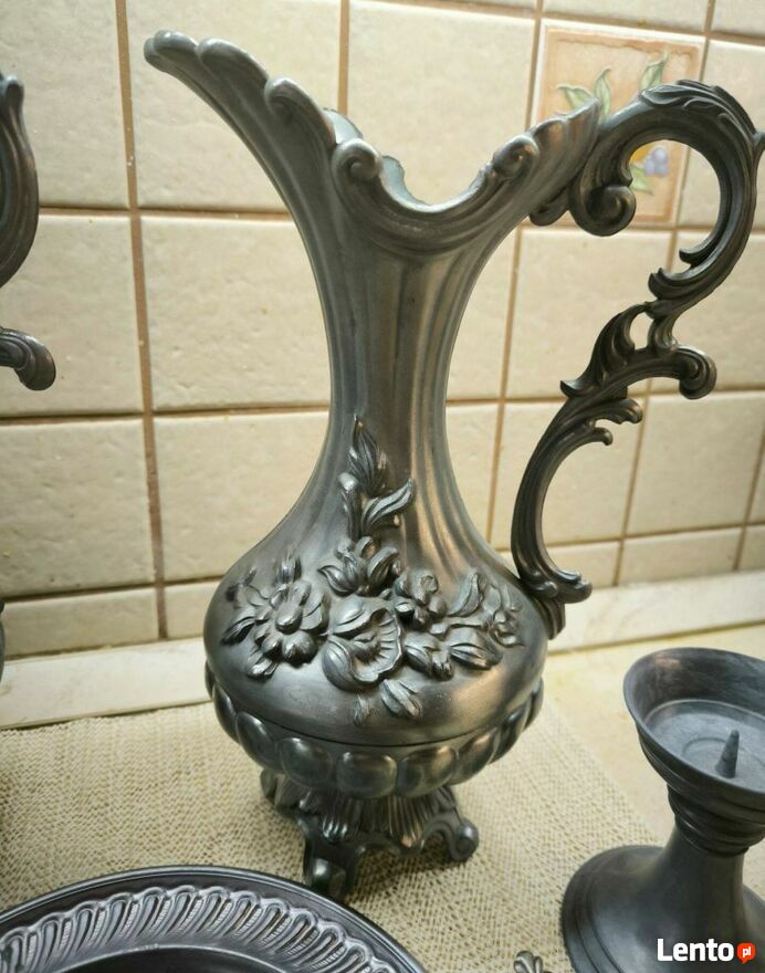 Zestaw dzbanków cynowych z dekoracją róż.