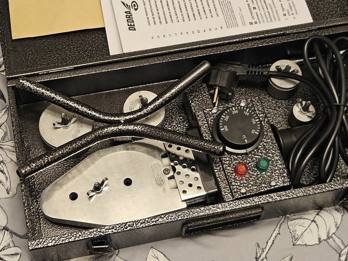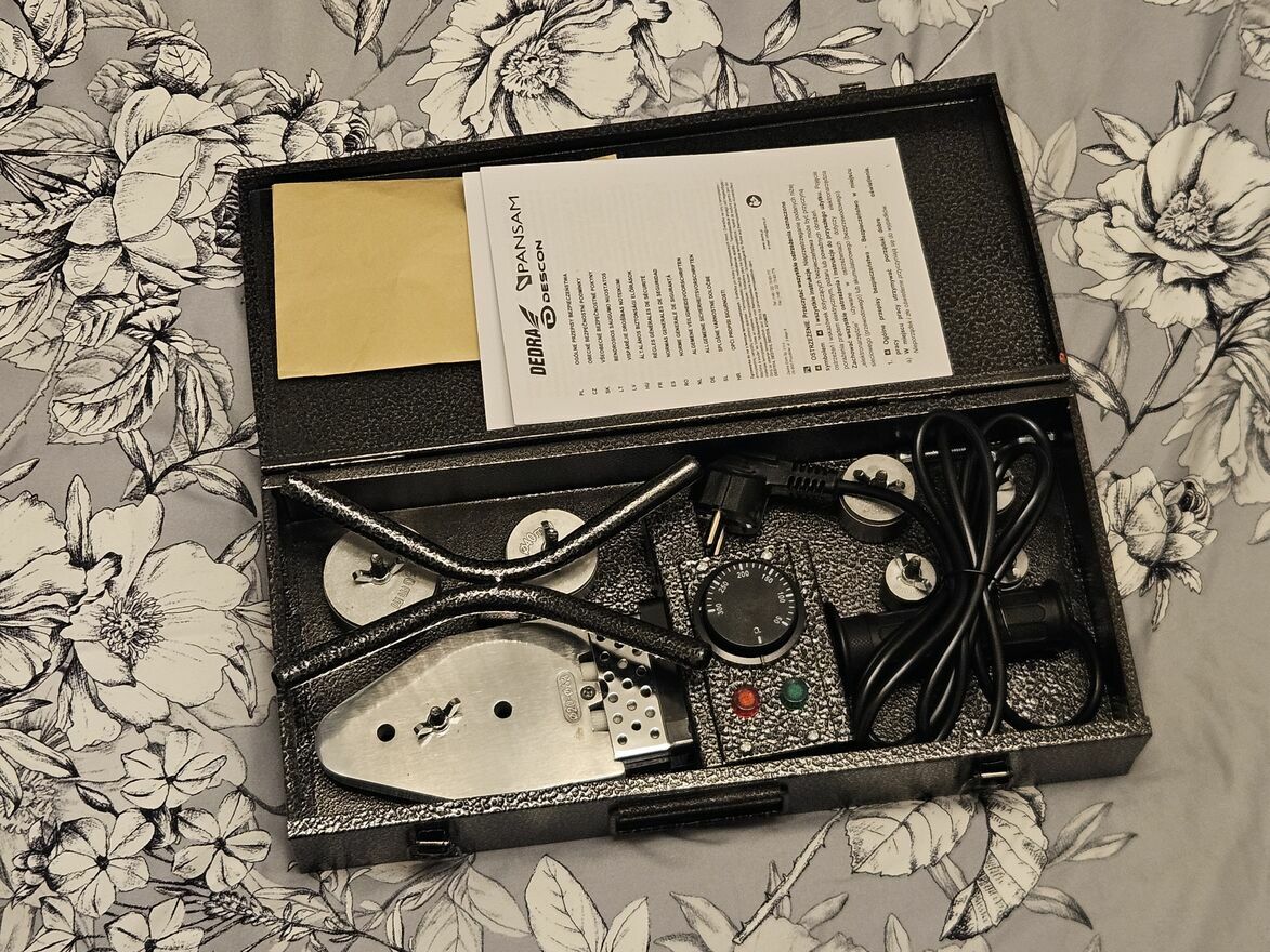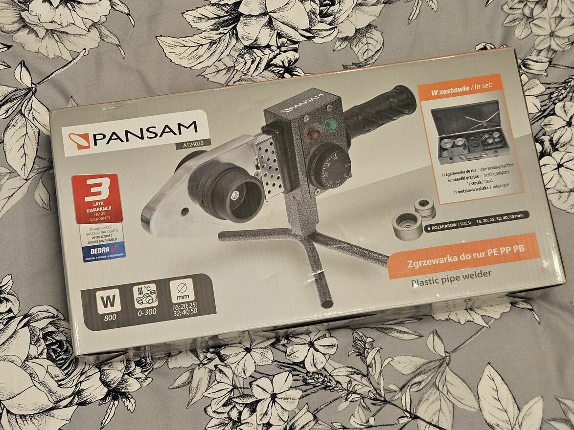 Sprzedam zgrzewarkę do rur i złączek z tworzyw sztucznych PANSAM A124020 800W. Służy do zgrzewania rur i kształtek z polimerów (PE- polietylen, PP-polipropylen, PB-polibuten) stosowanych podczas wykonywania instalacji wody, jak i centralnego ogrzewania. W wyposażeniu urządzenia znajdują się wymienne nasadki grzejne, które umożliwiają jednoczesne nagrzewanie wewnętrznej i zewnętrznej powierzchni łączonych elementów.Zgrzewarka A124020 posiada płynną regulację temperatury do maksymalnie 300°C.